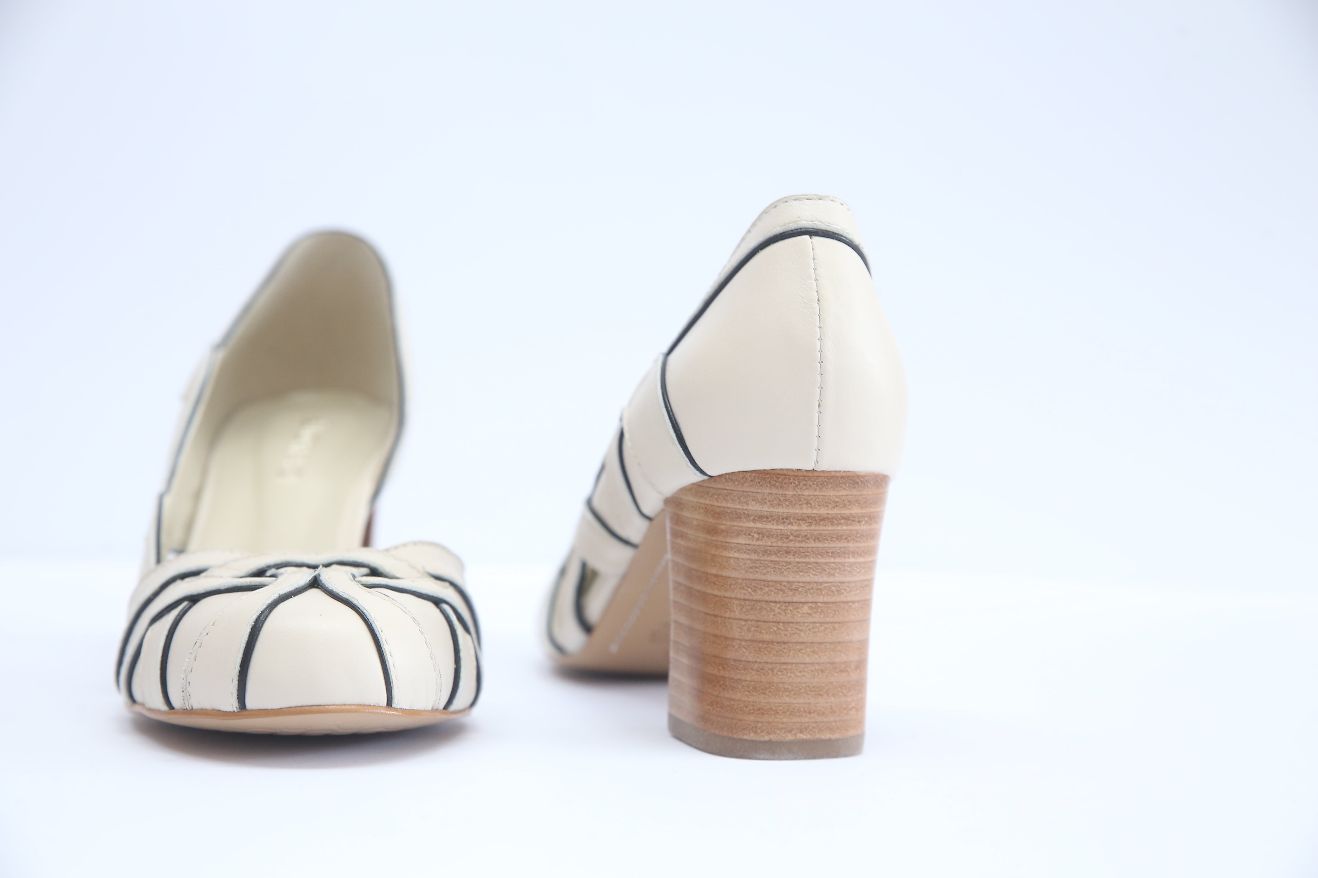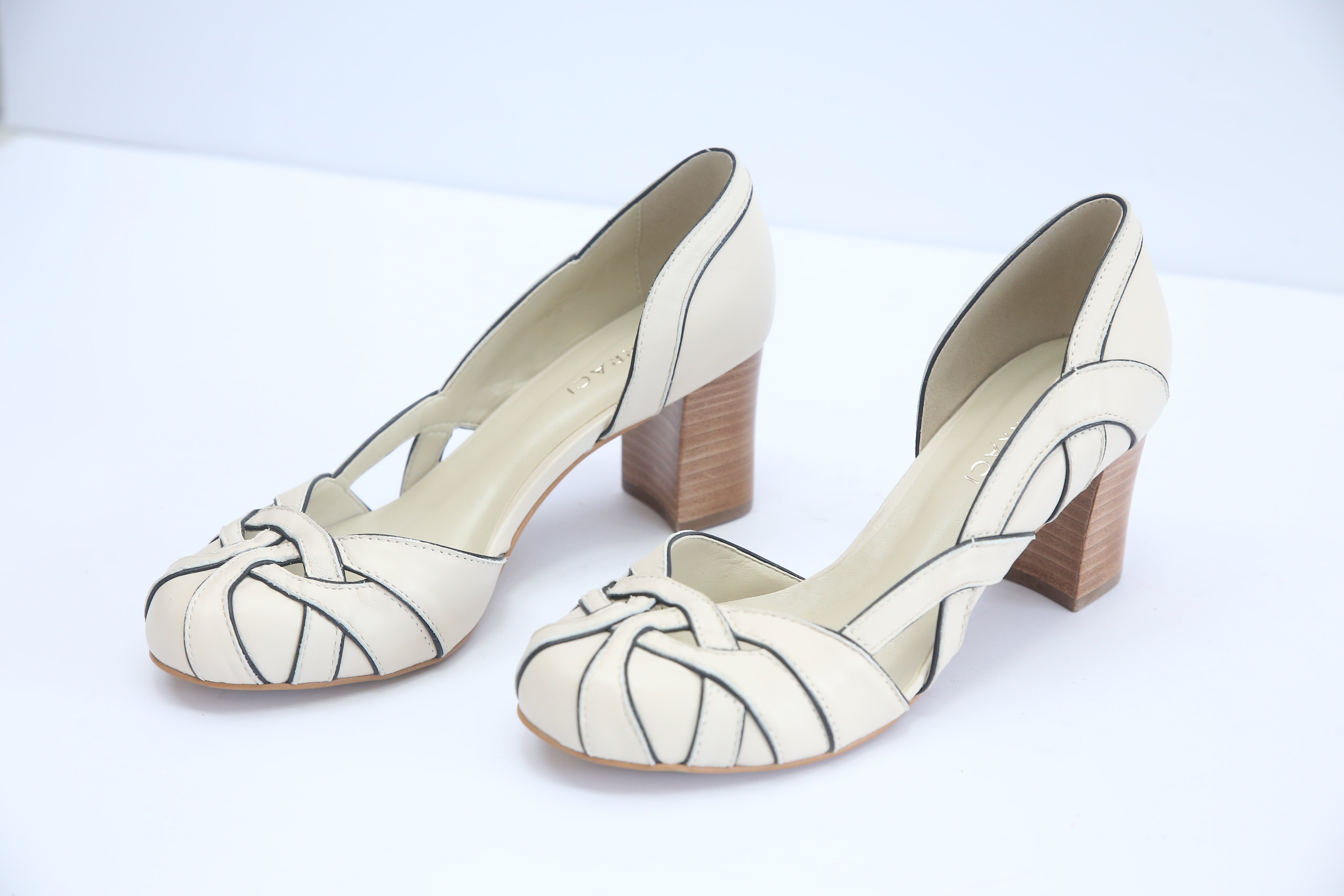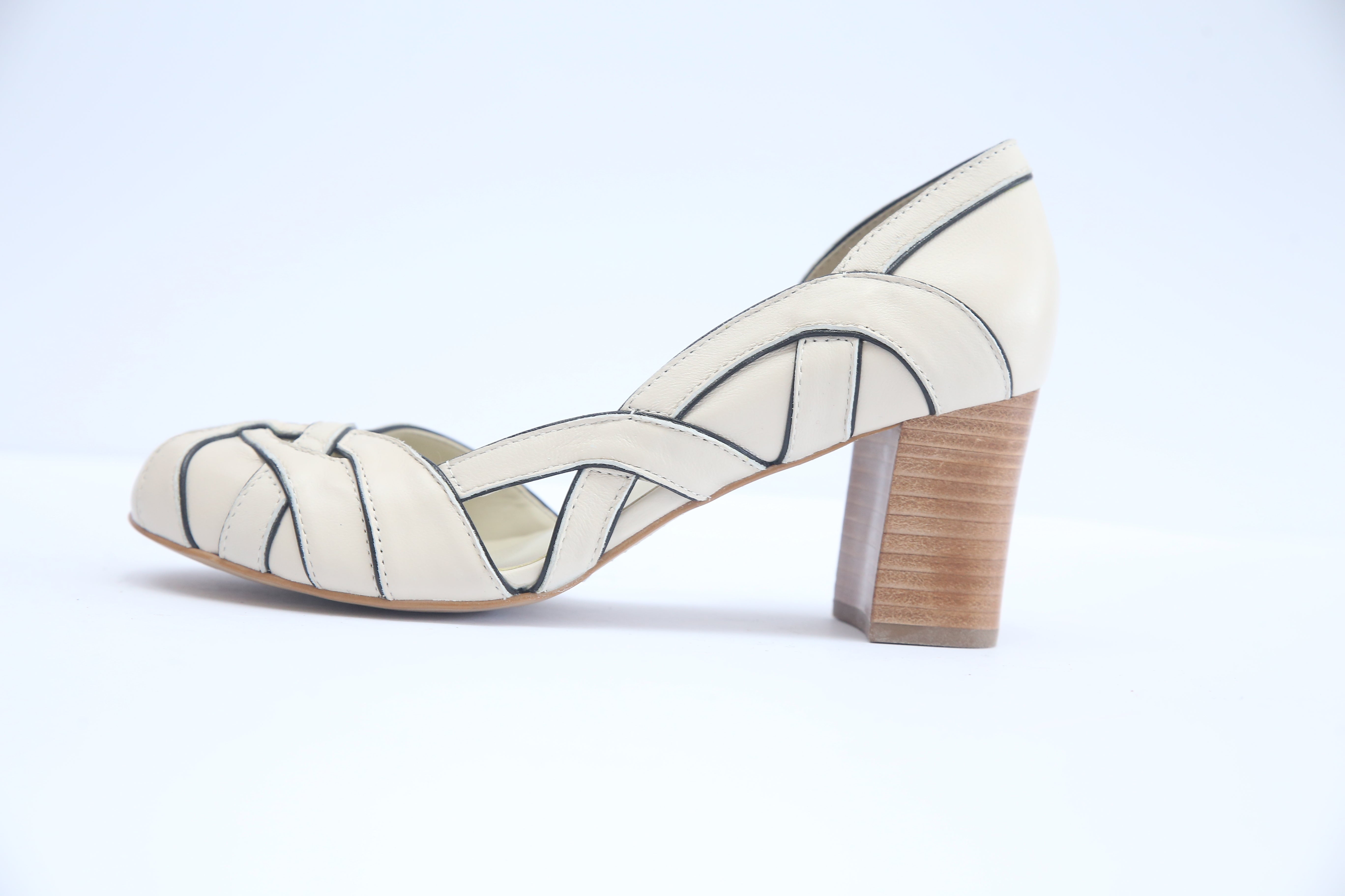 Zapato de cuero brasileño en tono crudo con delicados detalles en negro que realzan su diseño entrelazado. Su taco alto de madera aporta elegancia y firmeza, ideal para quienes buscan estilo y comodidad. Perfecto para ocasiones de día con un toque sofisticado.