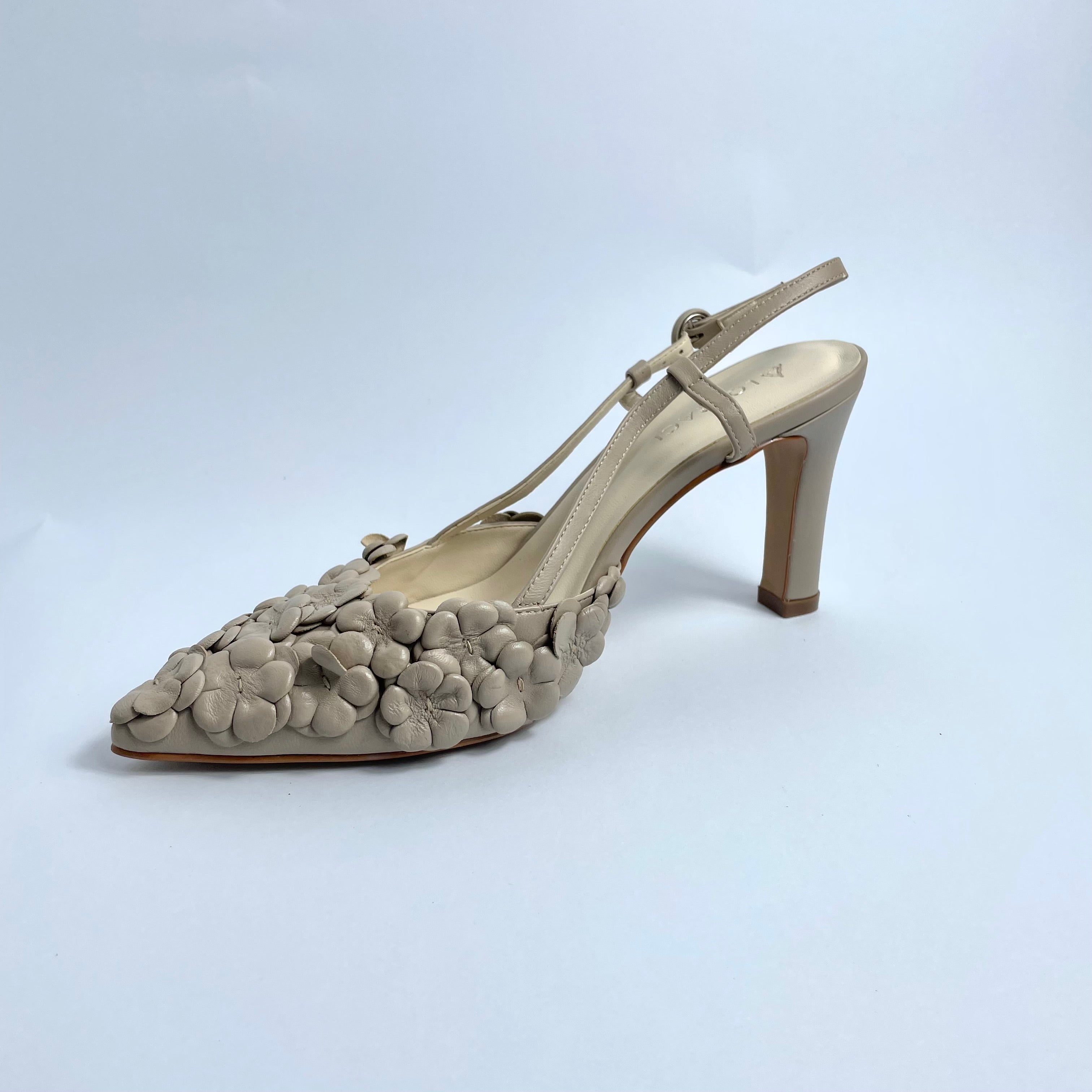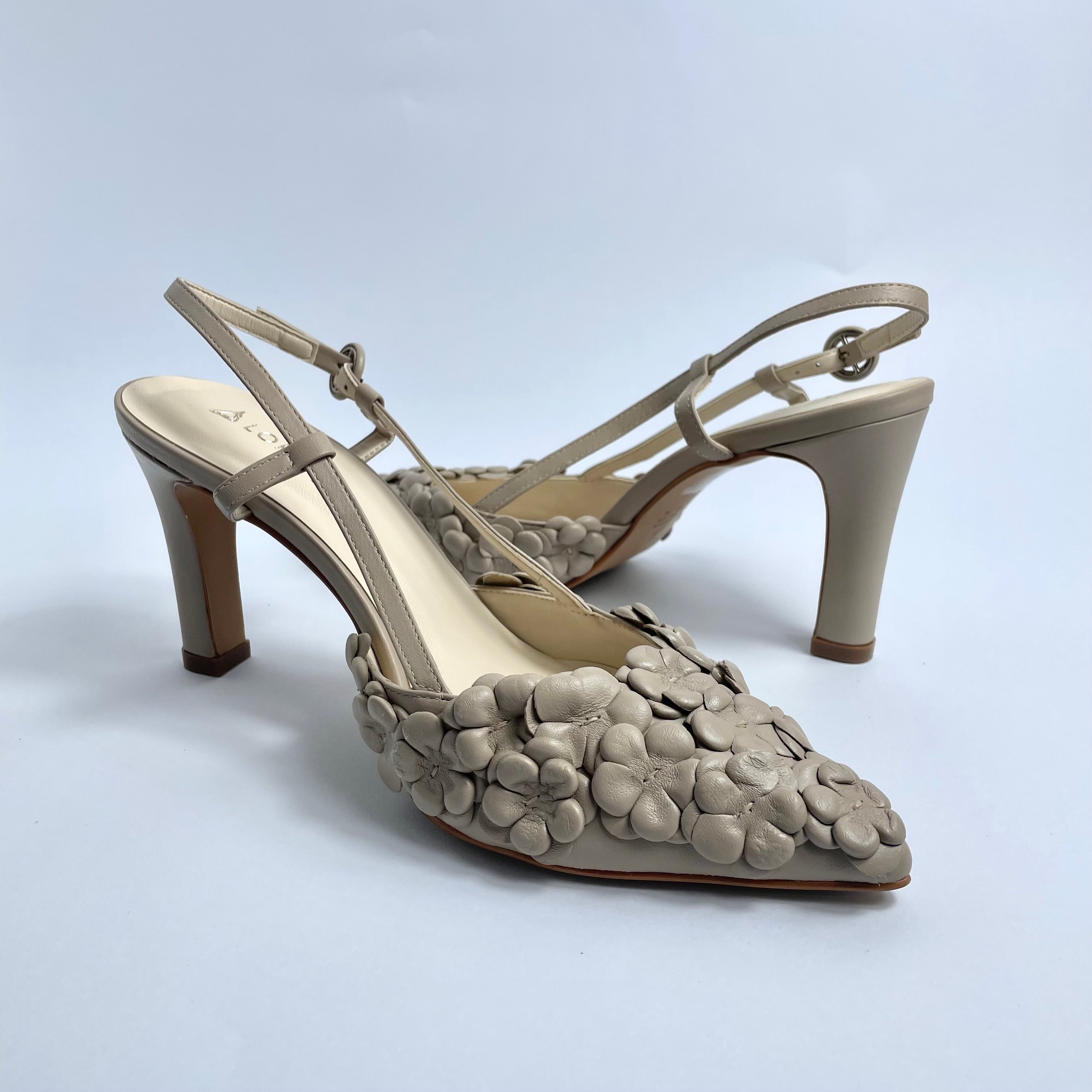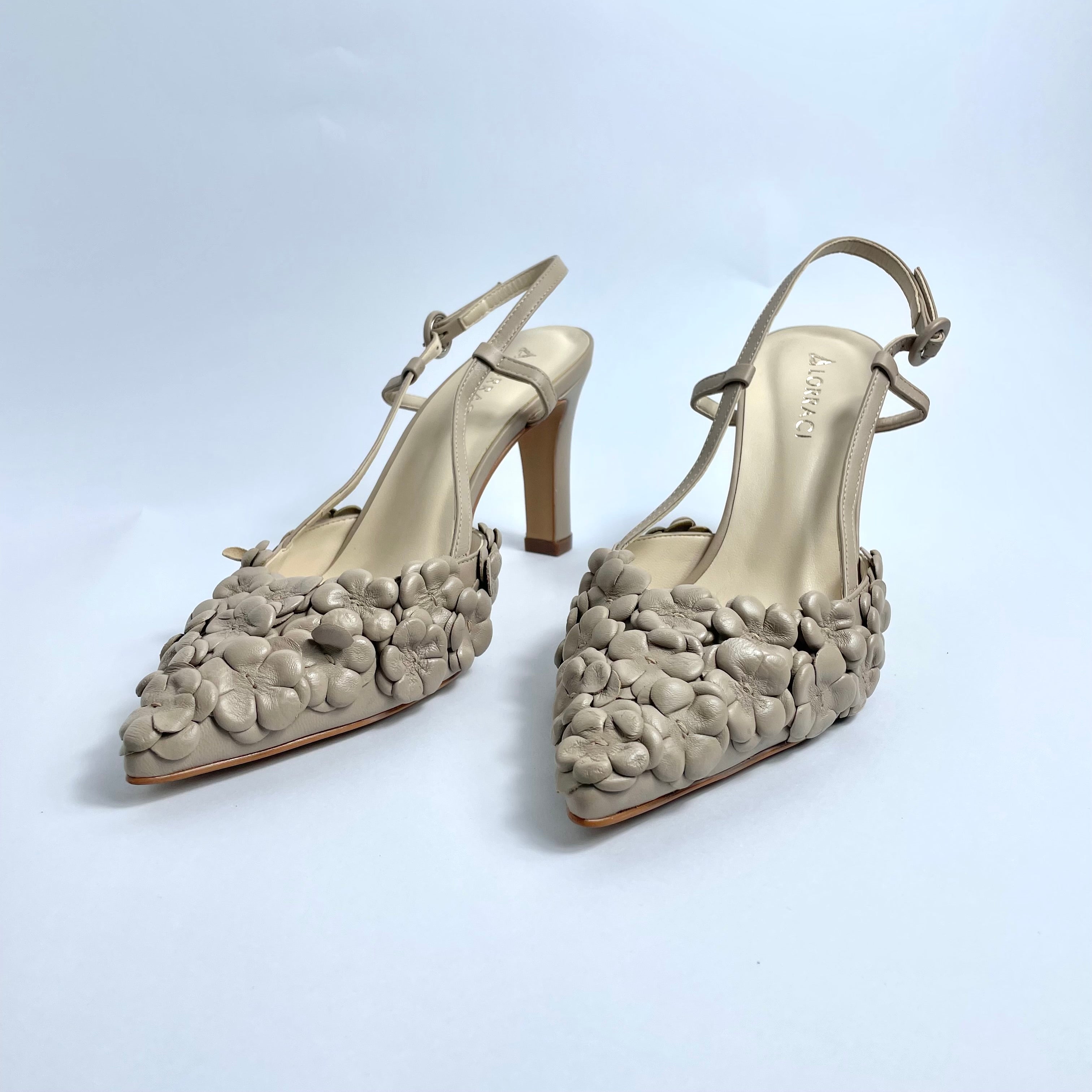 Tacón medio en tono nude con delicados apliques de flores en relieve que aportan textura y feminidad. Un modelo romántico y elegante, ideal para ocasiones especiales con un toque sofisticado.
