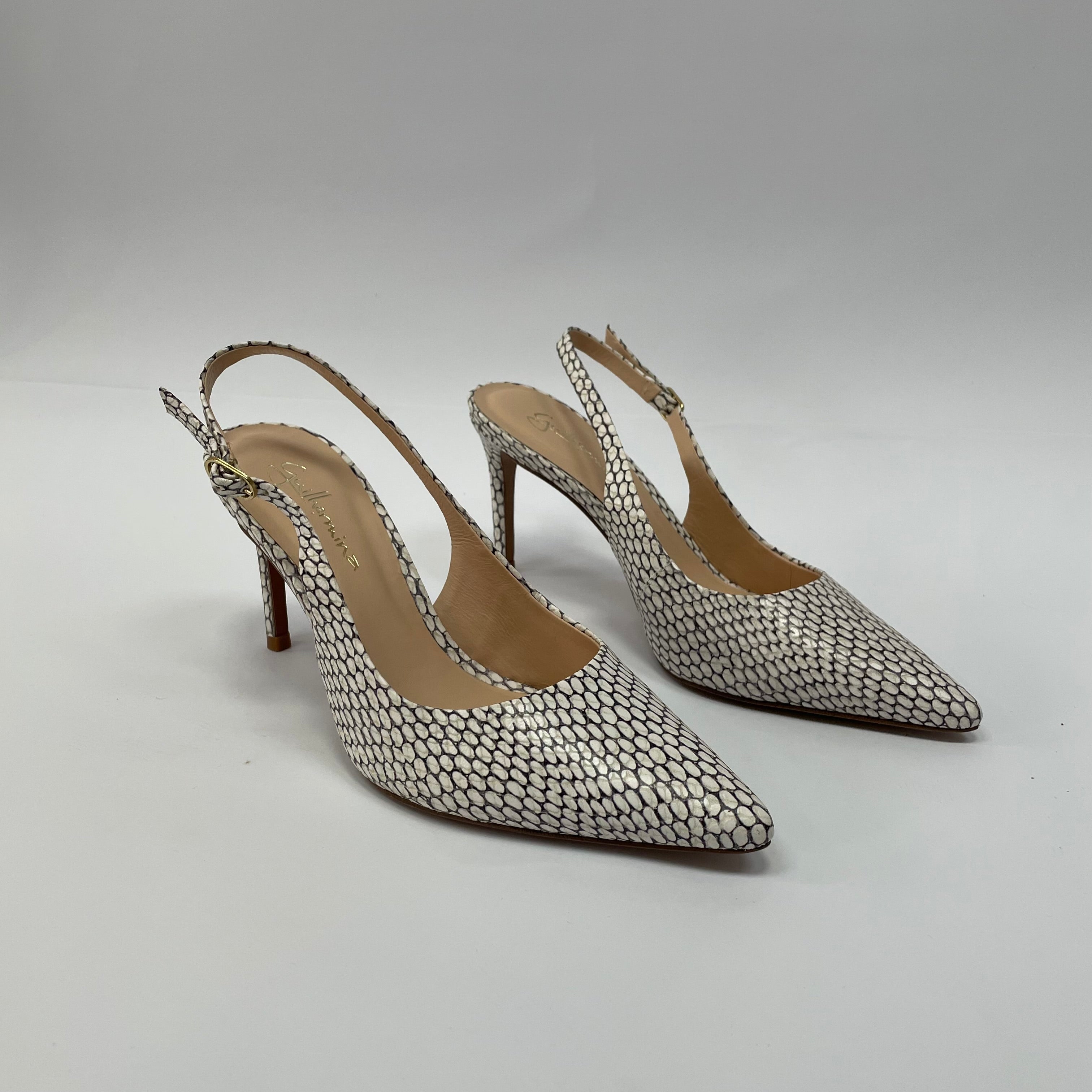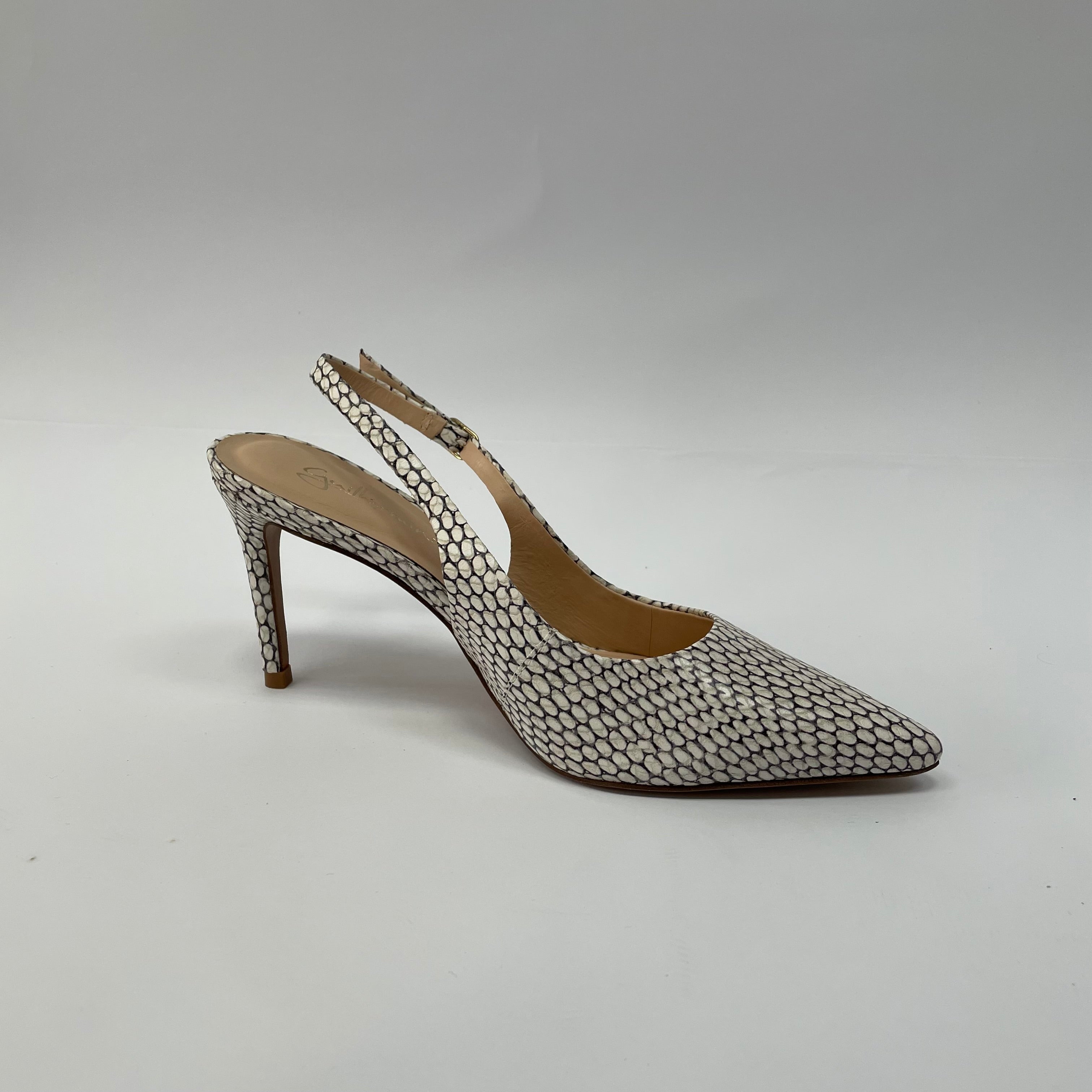 Estileto slingback de tacón fino con textura tipo reptil en blanco y negro. Su diseño elegante y sofisticado alarga visualmente la pierna, mientras que la correa ajustable brinda sujeción y seguridad. Perfecto para elevar cualquier look con un toque moderno y audaz.