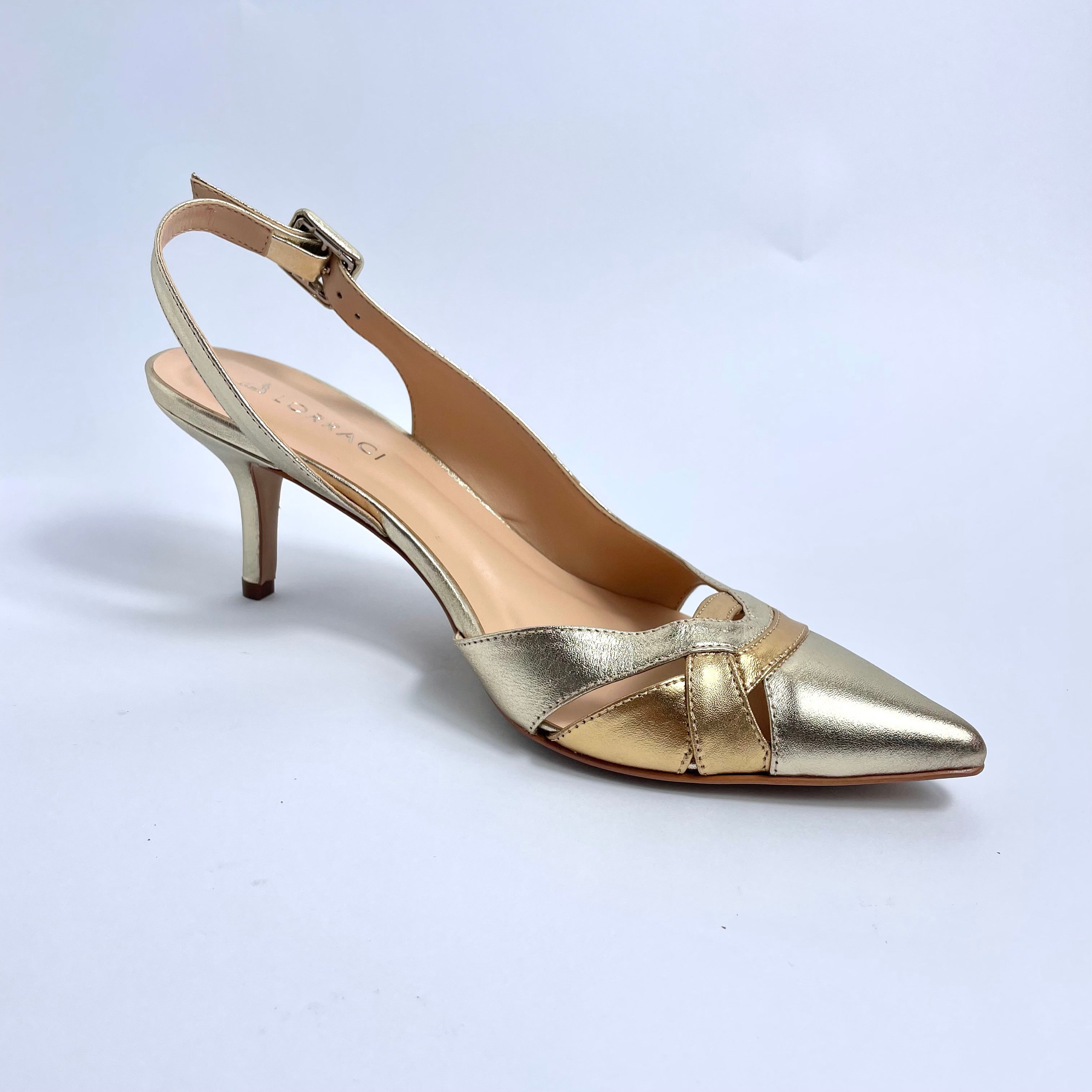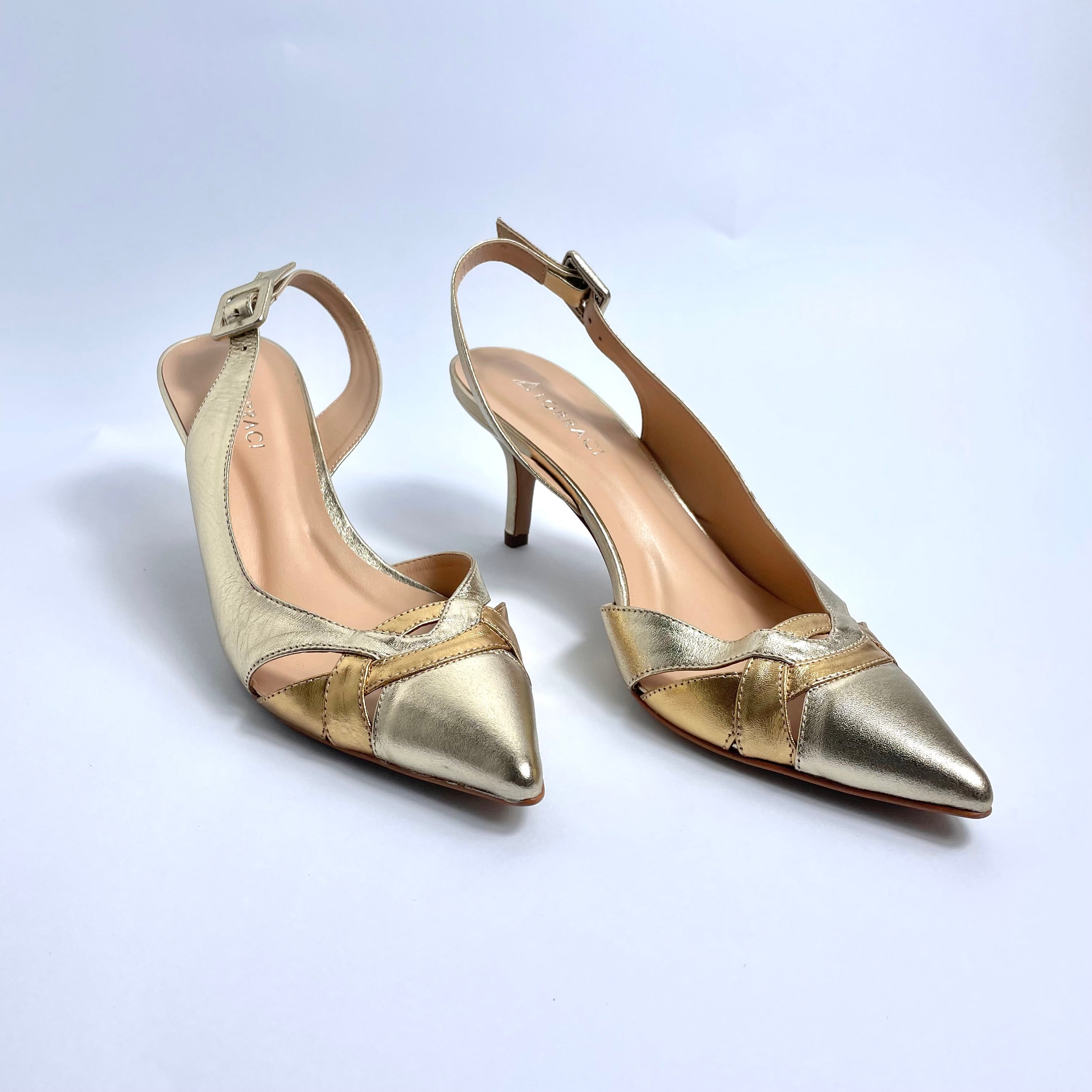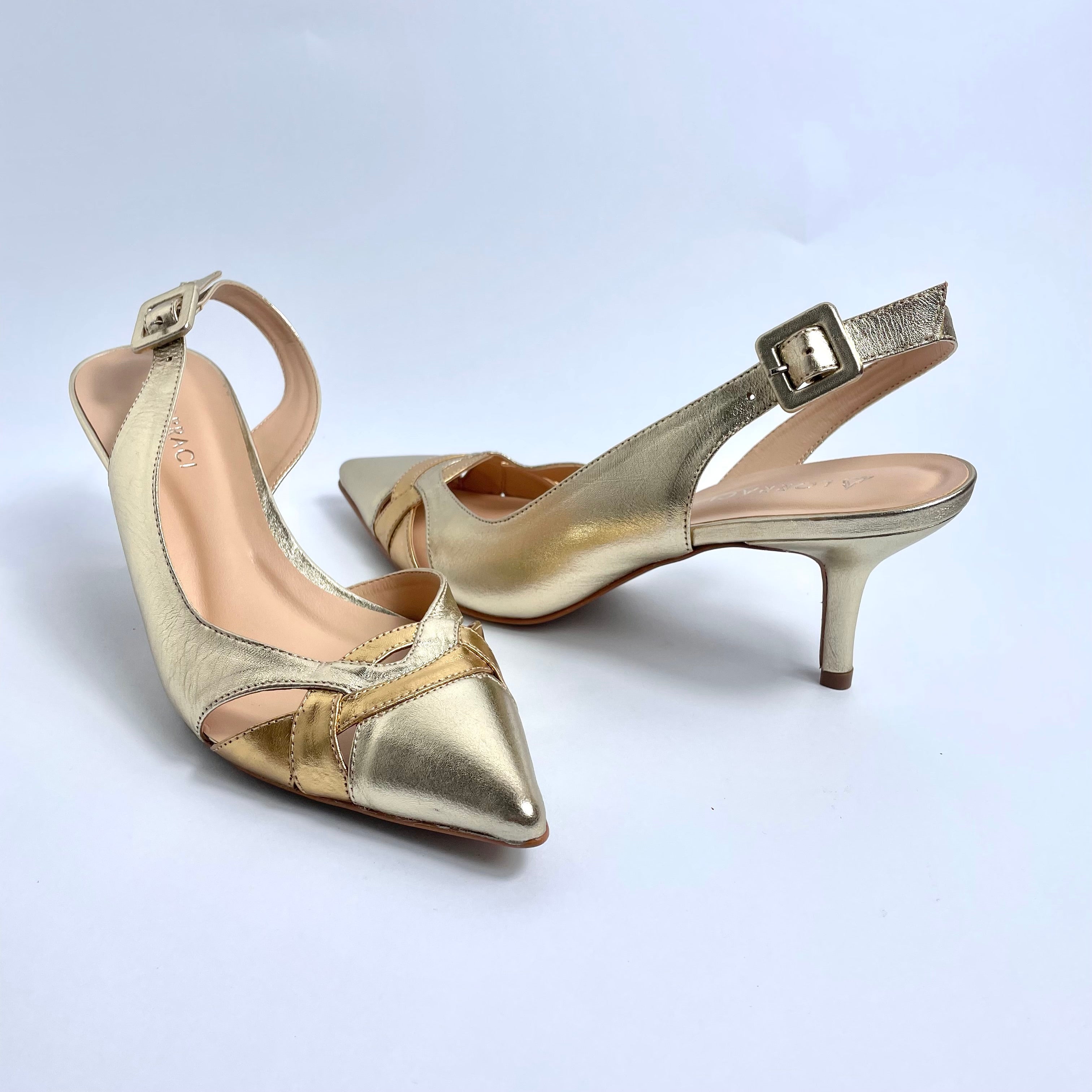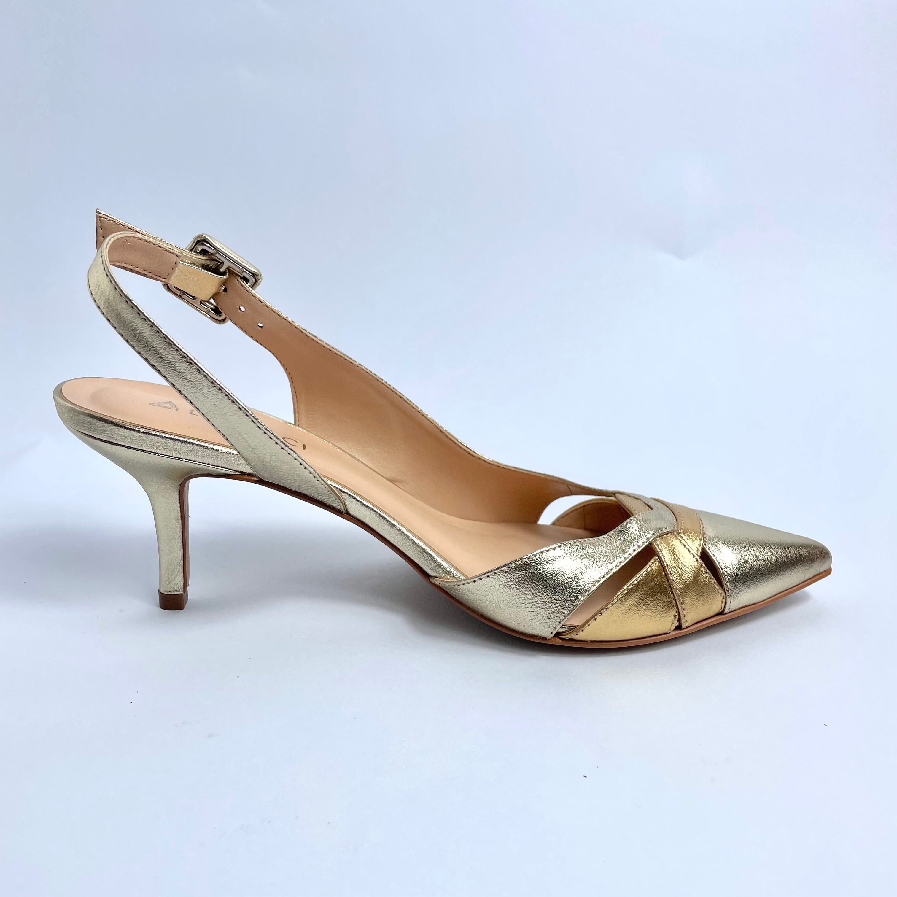 Tacón delgado en acabado dorado metalizado con diseño cruzado al frente. Un modelo sofisticado y versátil que realza cualquier look de noche o de evento especial