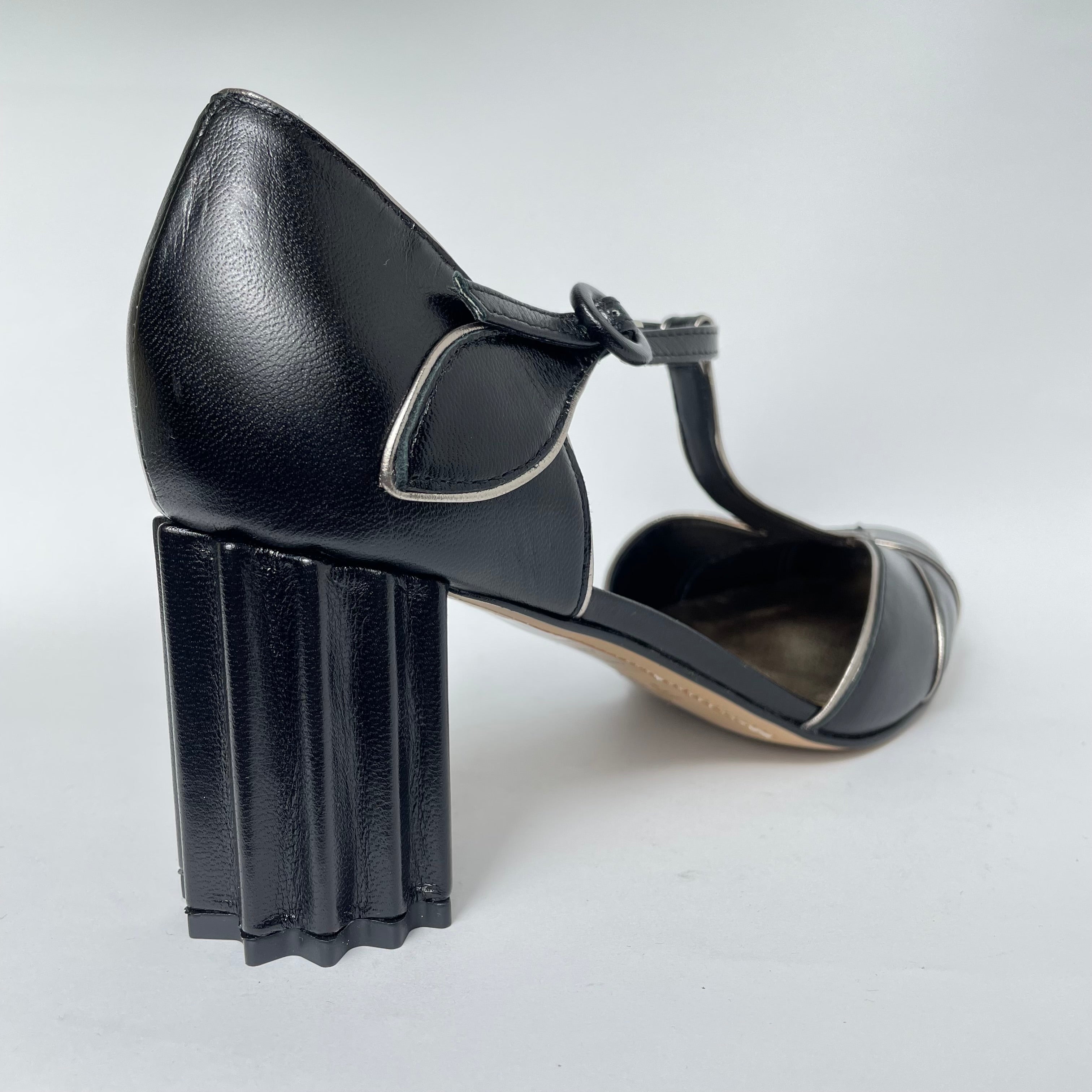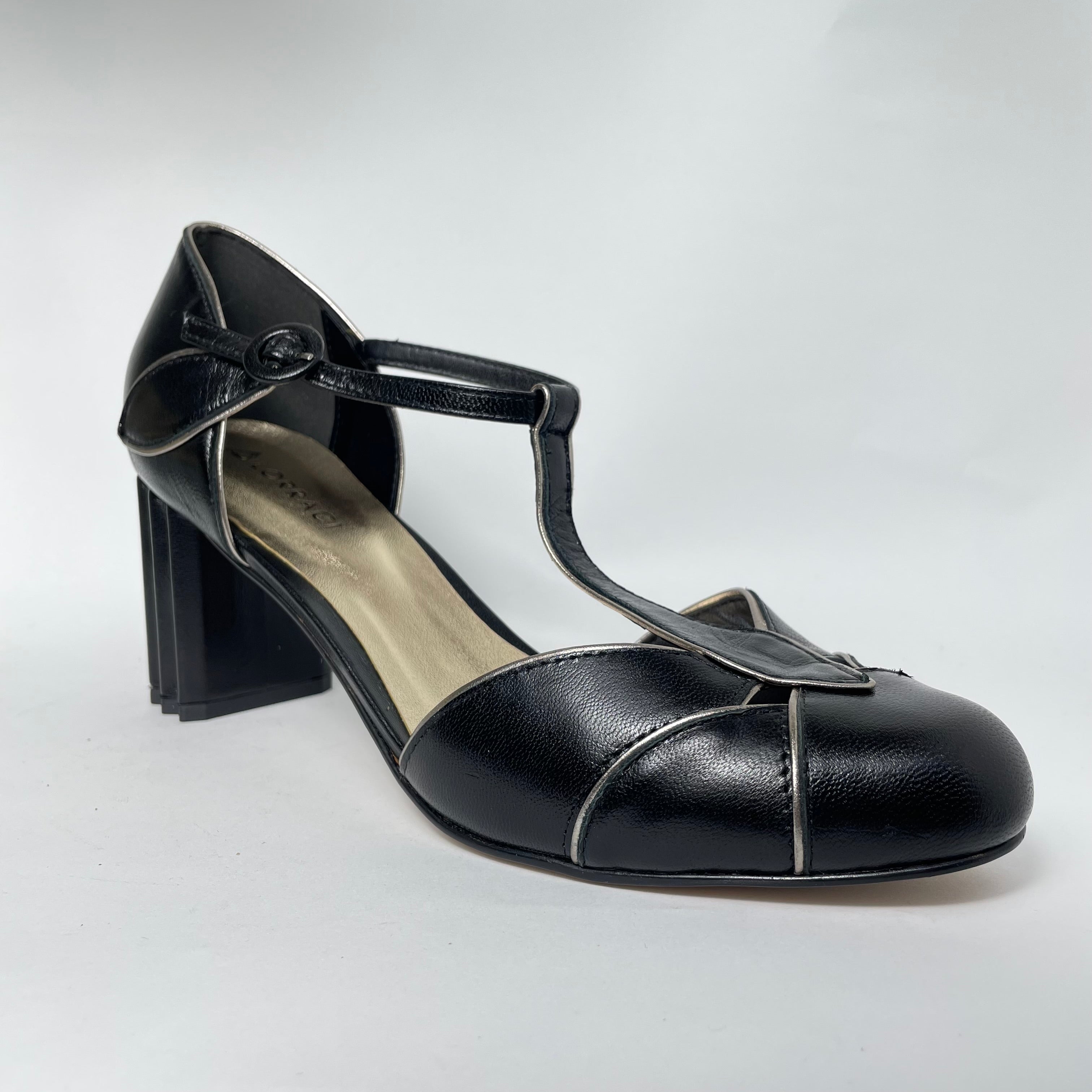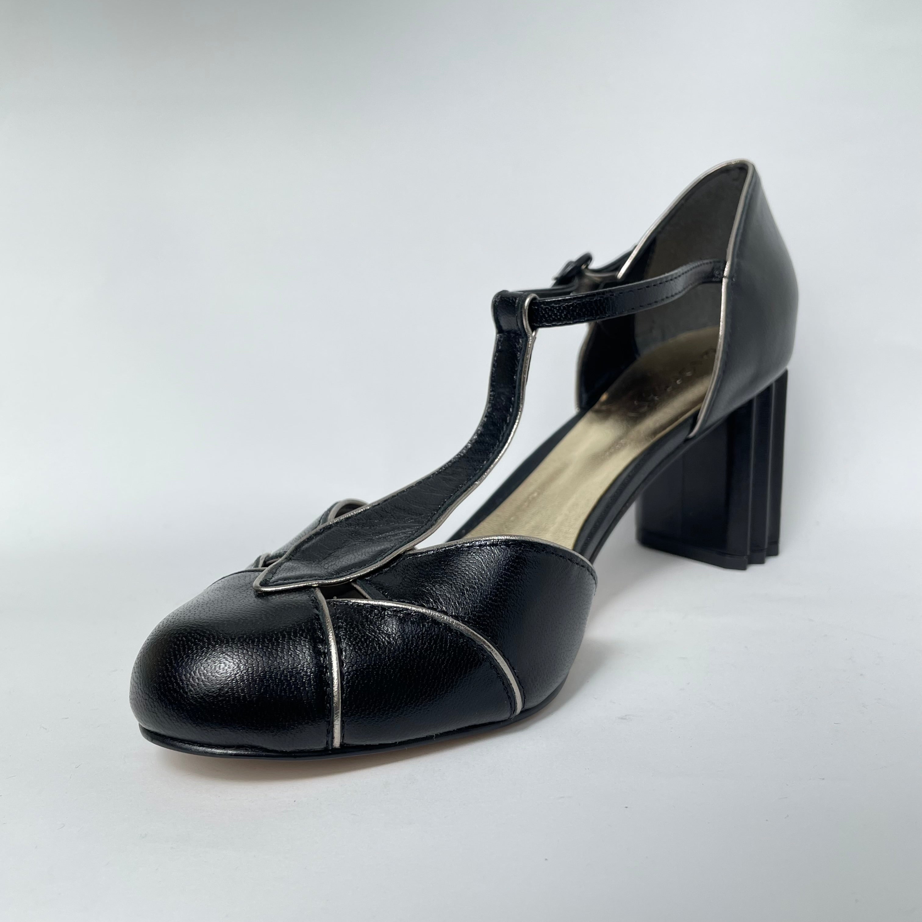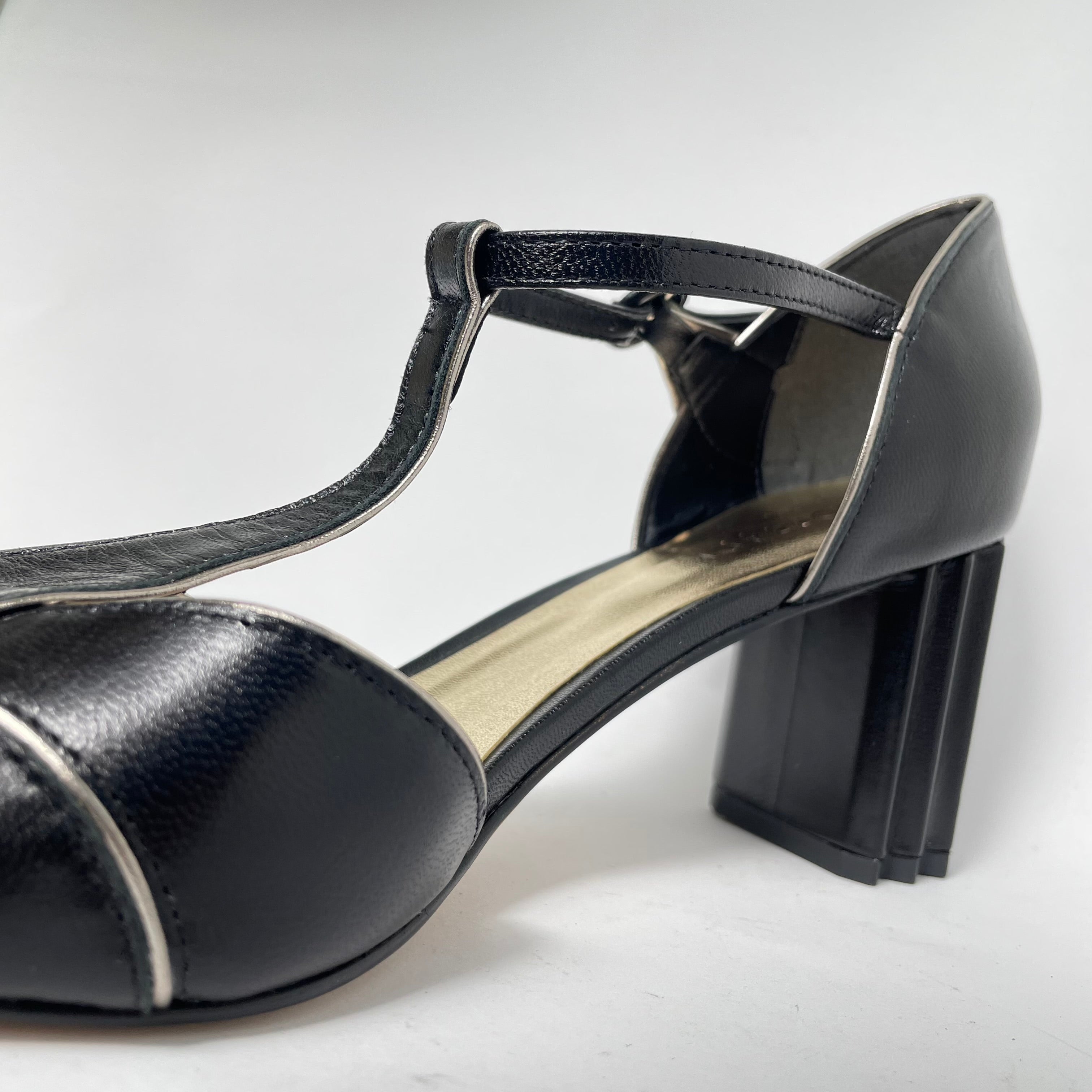 Elegancia clásica con un giro moderno. El modelo Mirella en color negro combina líneas suaves y femeninas con acabados metálicos que realzan su diseño. La correa tipo T aporta estilo y seguridad, mientras que el taco cuadrado con textura lo convierte en una pieza única y cómoda para usar durante horas. Perfecto para eventos, cenas o elevar cualquier look con un toque sofisticado.