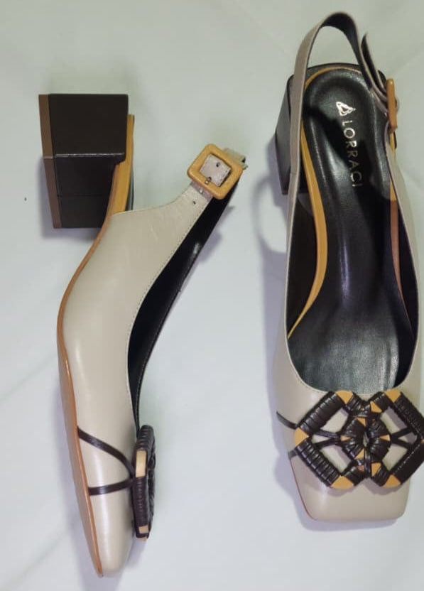 Fabricado en cuero brasileño, su color crema combinado con acentos en café profundo y mostaza crea una armonía visual sobria y moderna. El tacón ancho y estable lo convierte en el aliado ideal para caminar con seguridad y estilo, desde la oficina hasta una salida especial.
