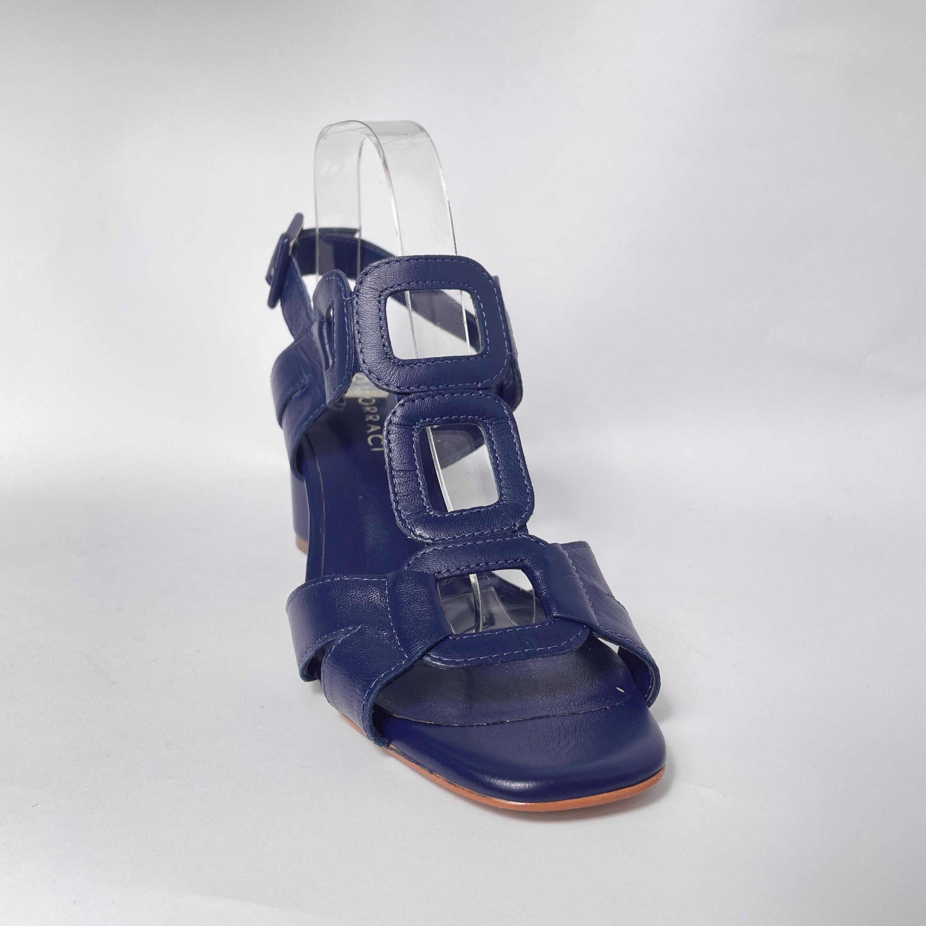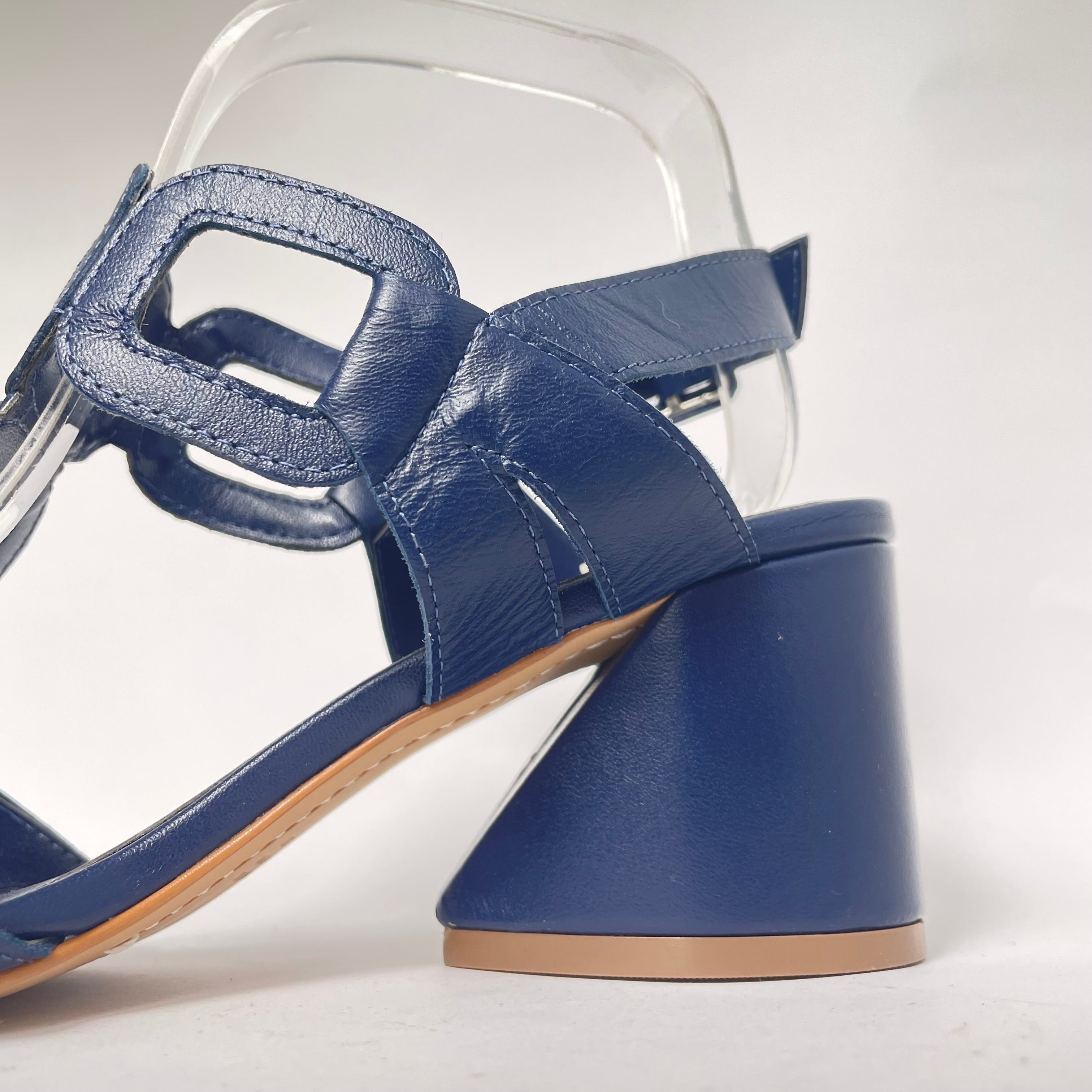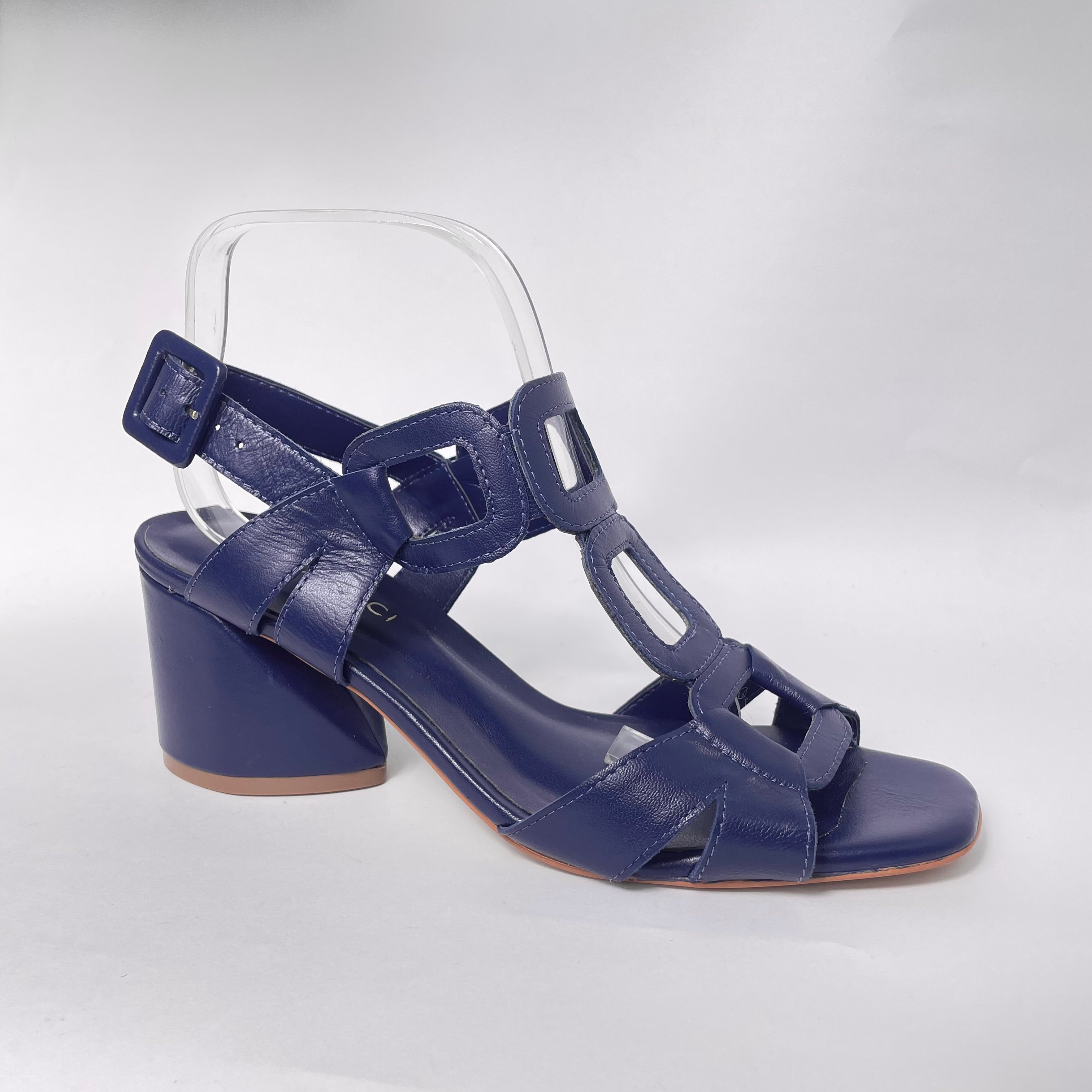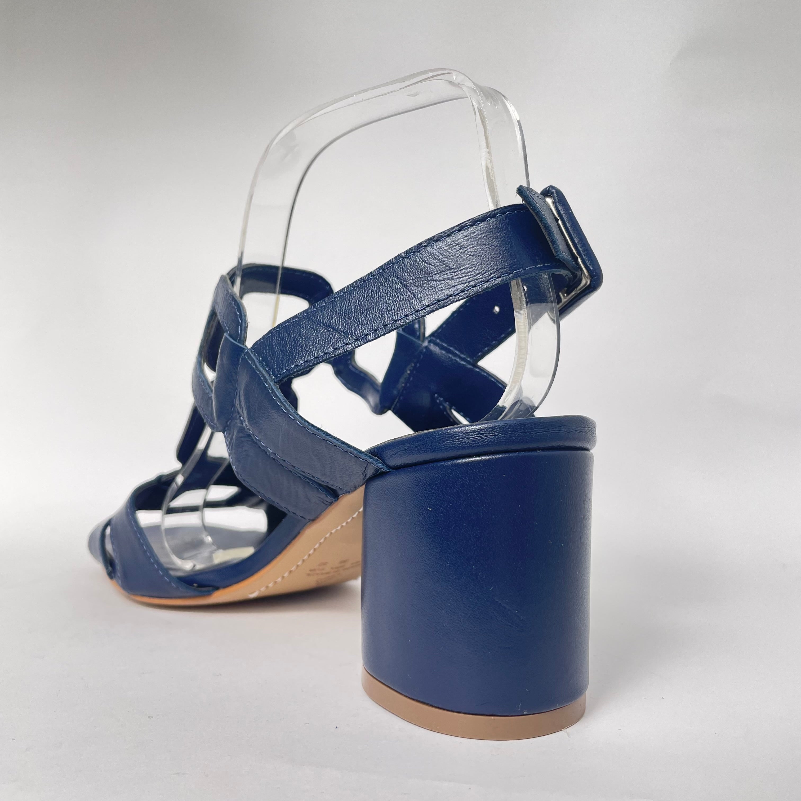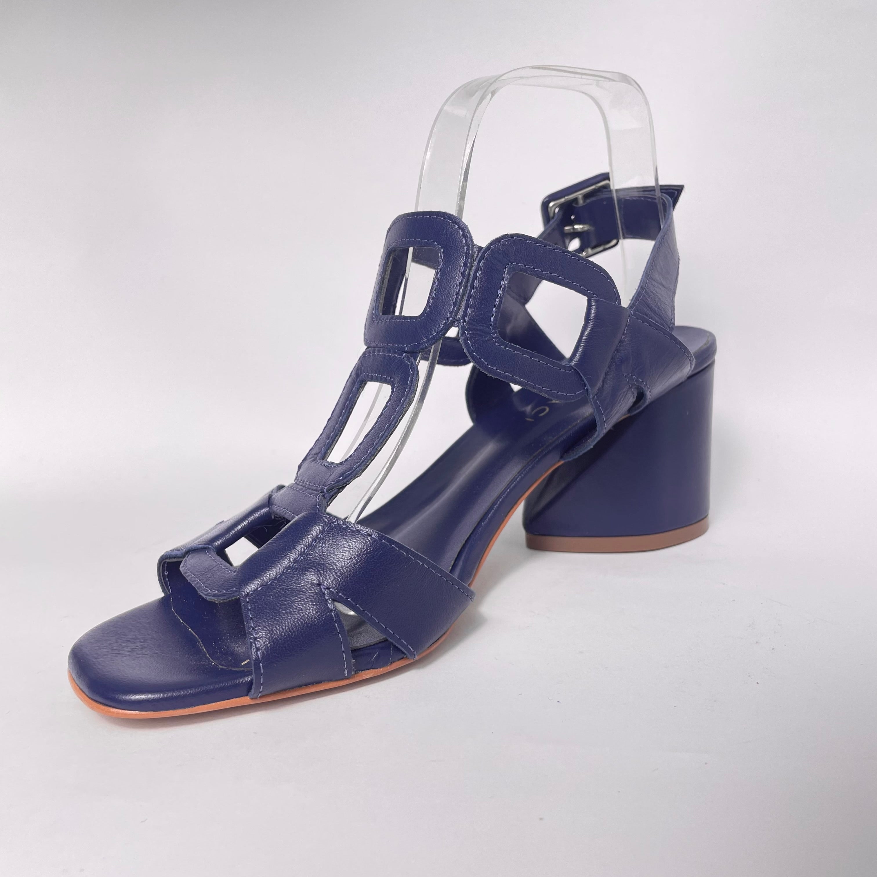 Estructura moderna con un guiño retro. Nora Azul destaca por su diseño geométrico de tiras cuadradas que envuelven el pie con firmeza y estilo. Su tono azul profundo le da versatilidad para combinar tanto con tonos neutros como con colores vibrantes.