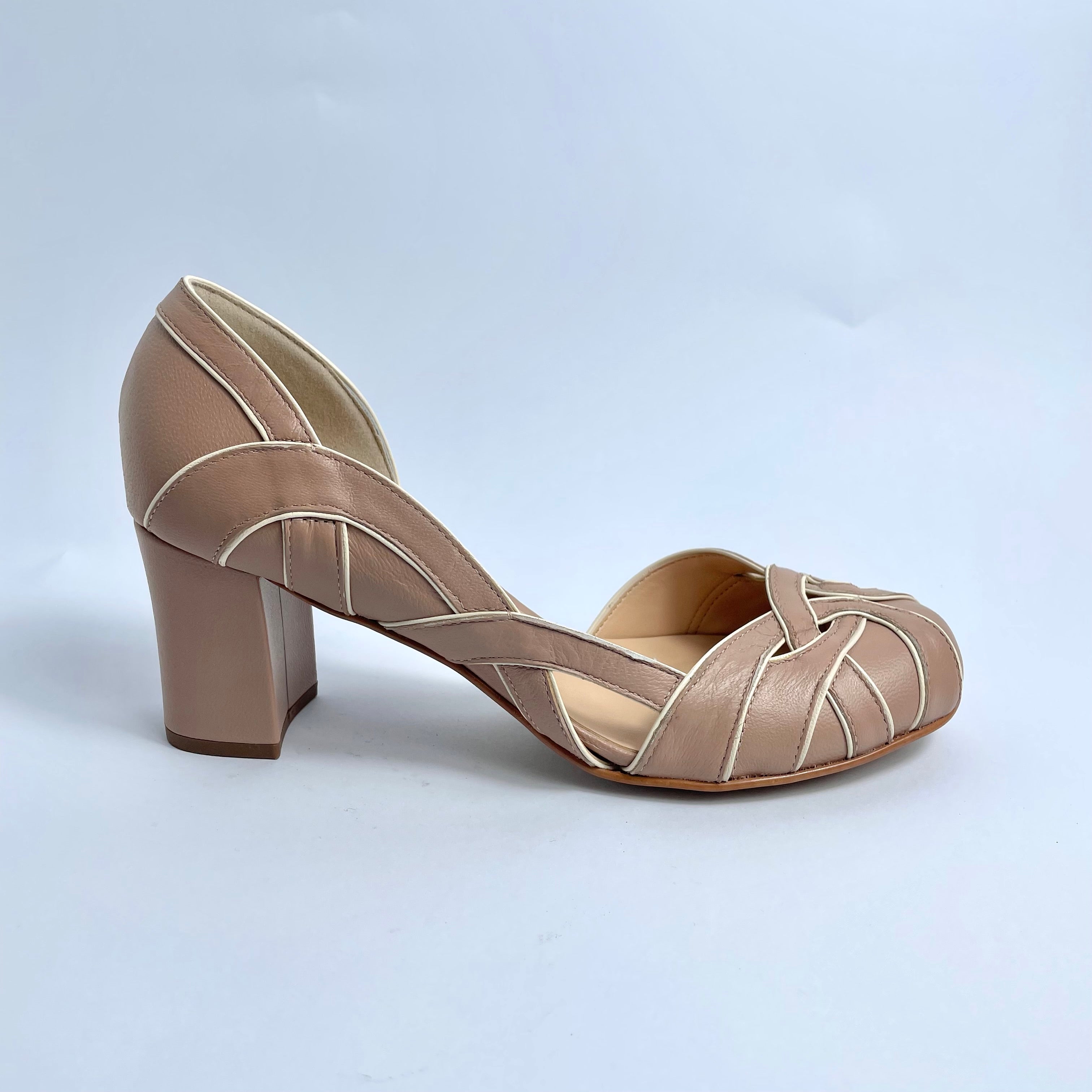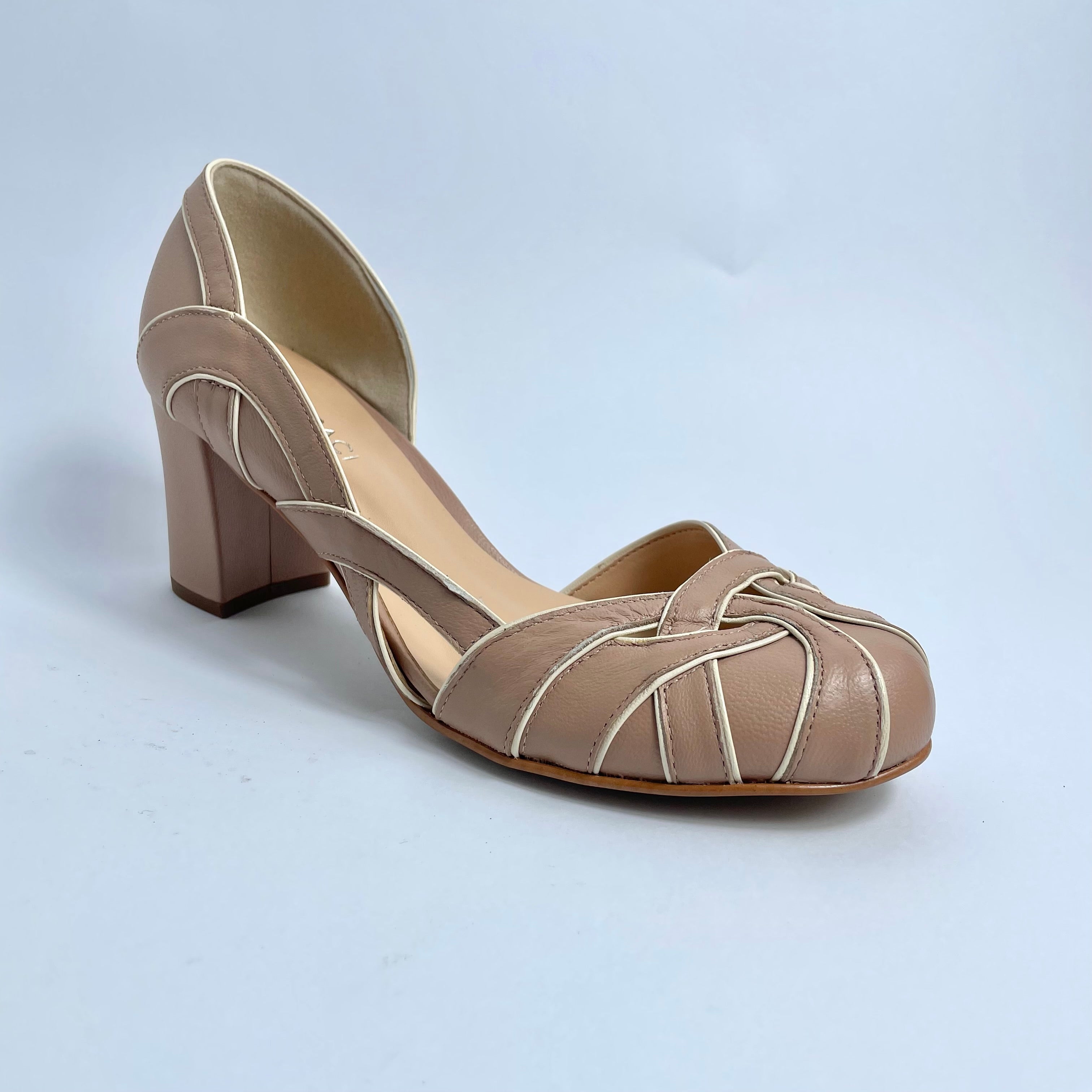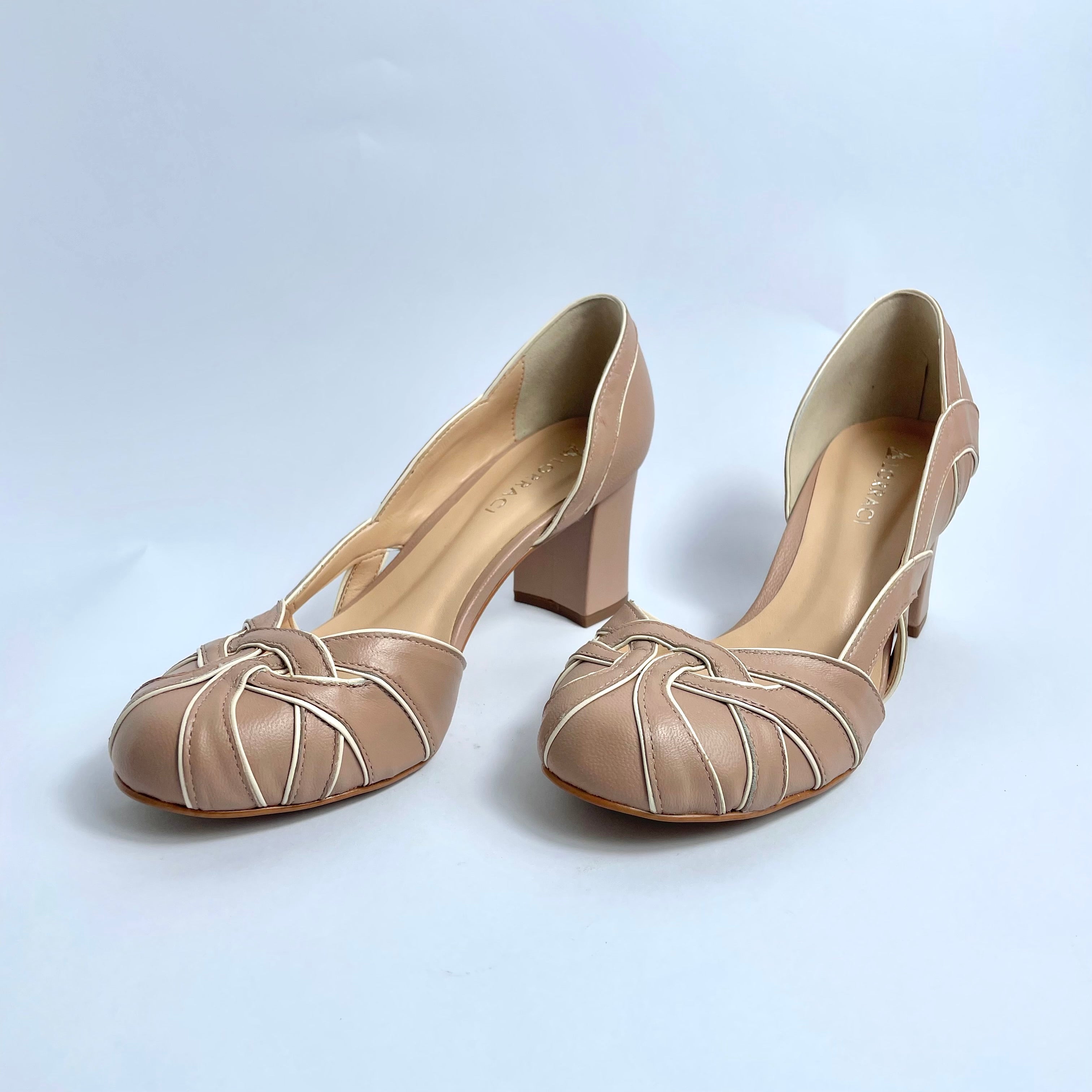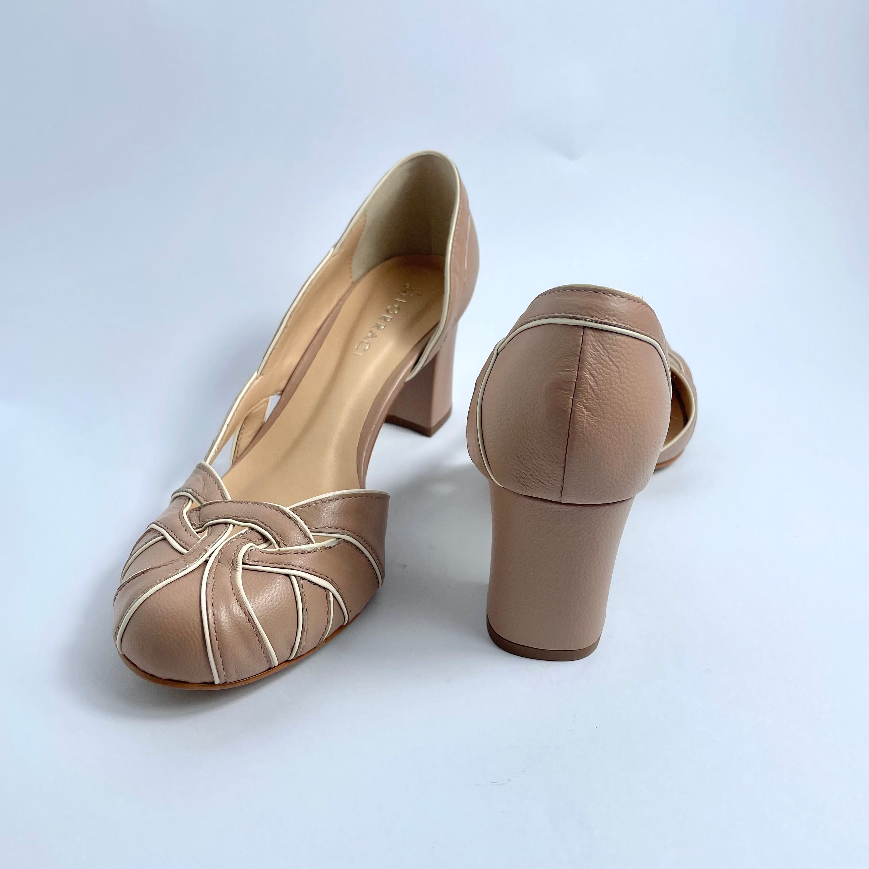 Tacón medio cuadrado en tono nude con detalle de tiras entrelazadas al frente y acabado en contraste. Un diseño clásico y elegante que brinda comodidad sin perder estilo.