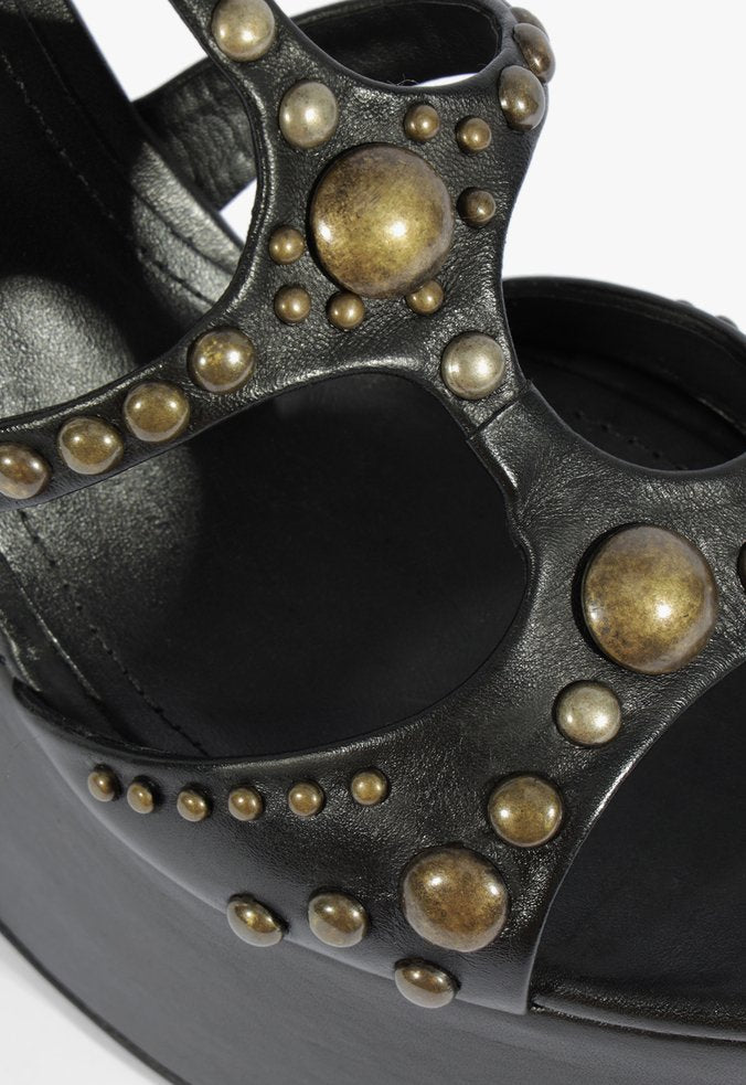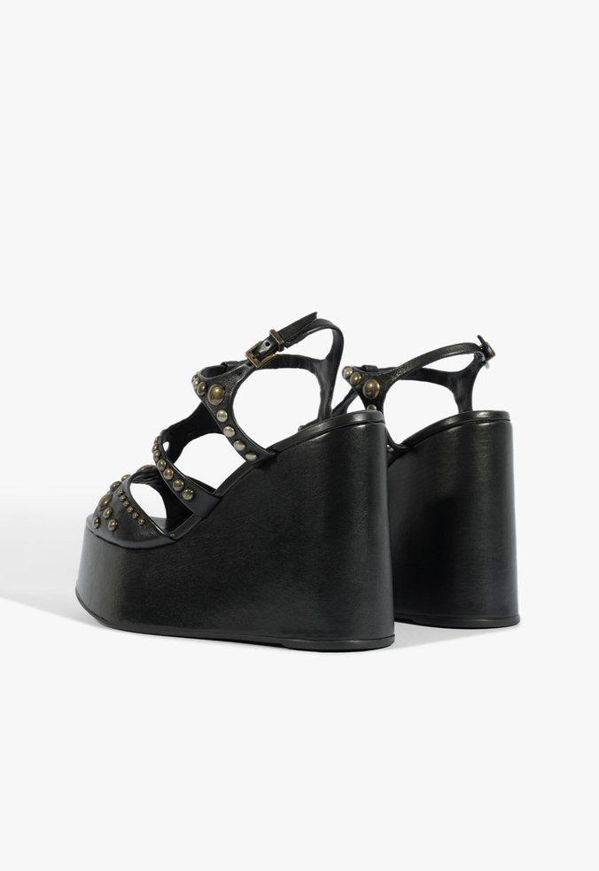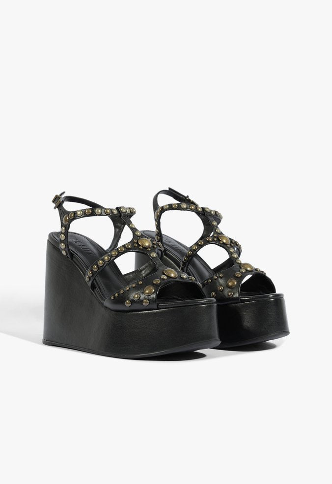 Una cuña imponente en negro con aplicaciones metálicas que marcan presencia en cada paso. Su diseño con tiras entrecruzadas y plataforma alta combina actitud, modernidad y comodidad. Perfecta para darle un aire edgy y sofisticado a tus looks nocturnos o de ocasión especial.