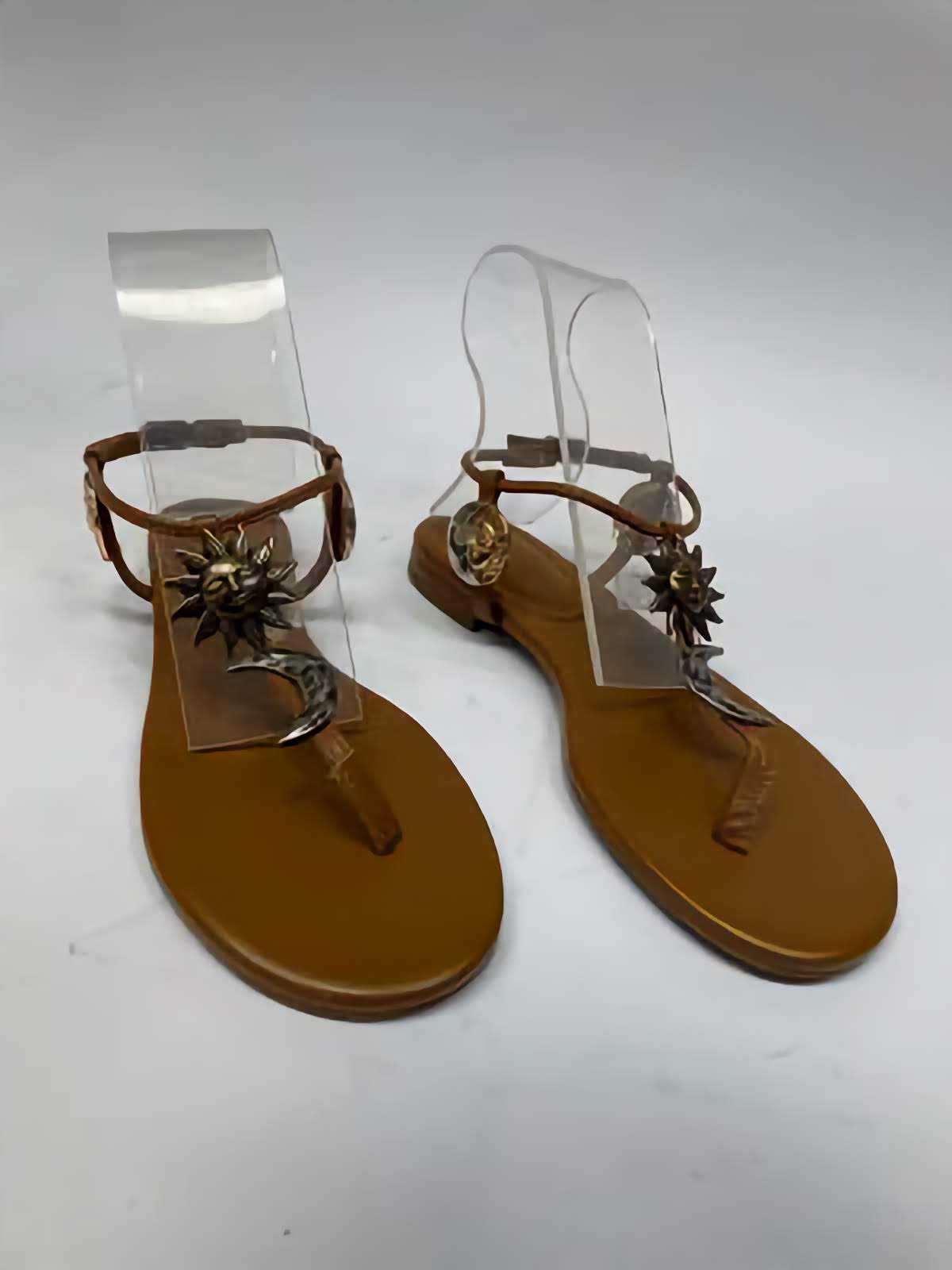 Sandalia de piel marrón para mujer con tacón cuadrado minimalista y punta redondeada. Presenta una fina tira con detalles metálicos de soles y lunas, que se conecta a otra tira fina que se extiende sobre el pie y rodea el tobillo, asegurándose con una hebilla metálica lateral. La sandalia también incluye un detalle lateral metálico, una plantilla lisa a juego con el color del zapato y un tacón diseñado con la artesanía brasileña de Lolly.