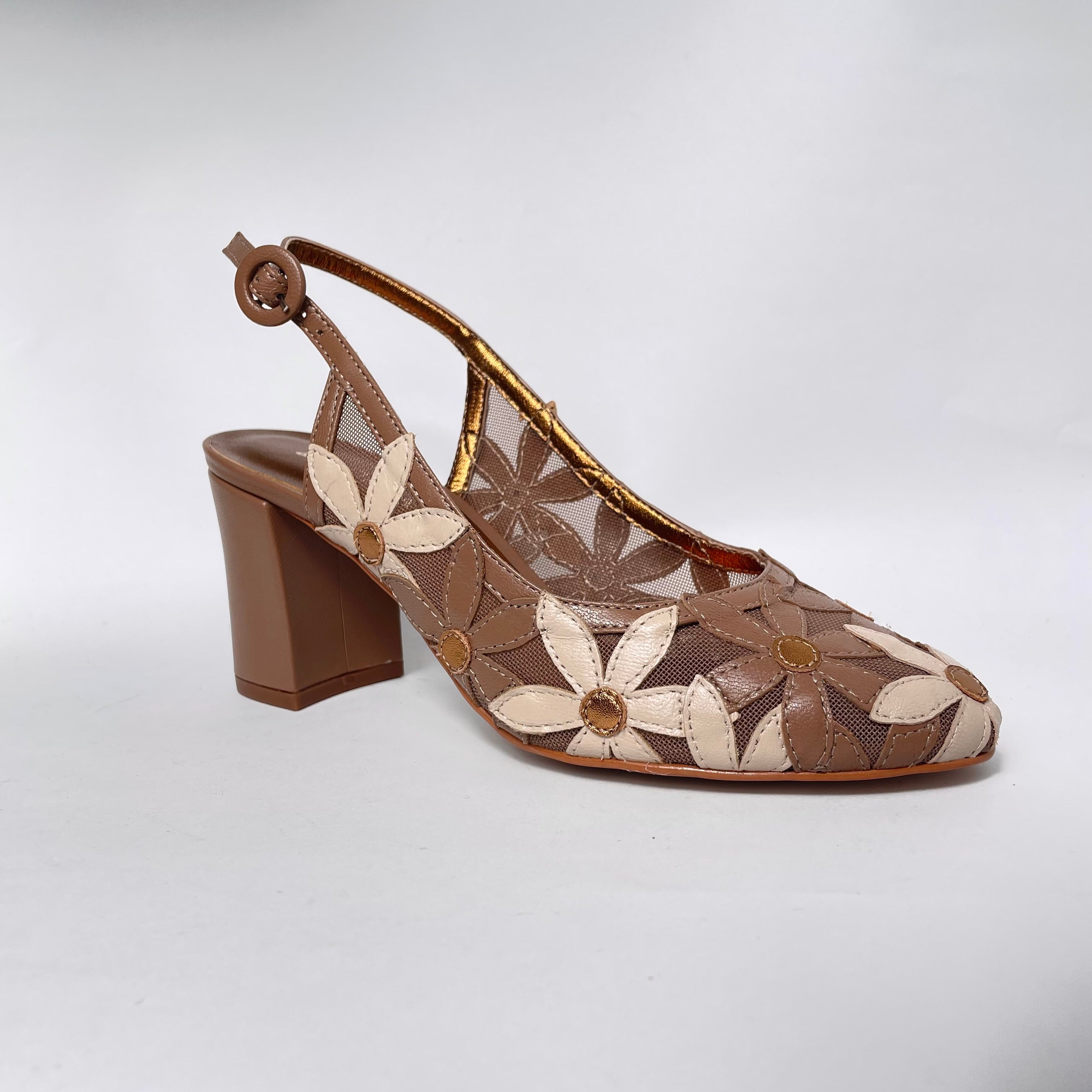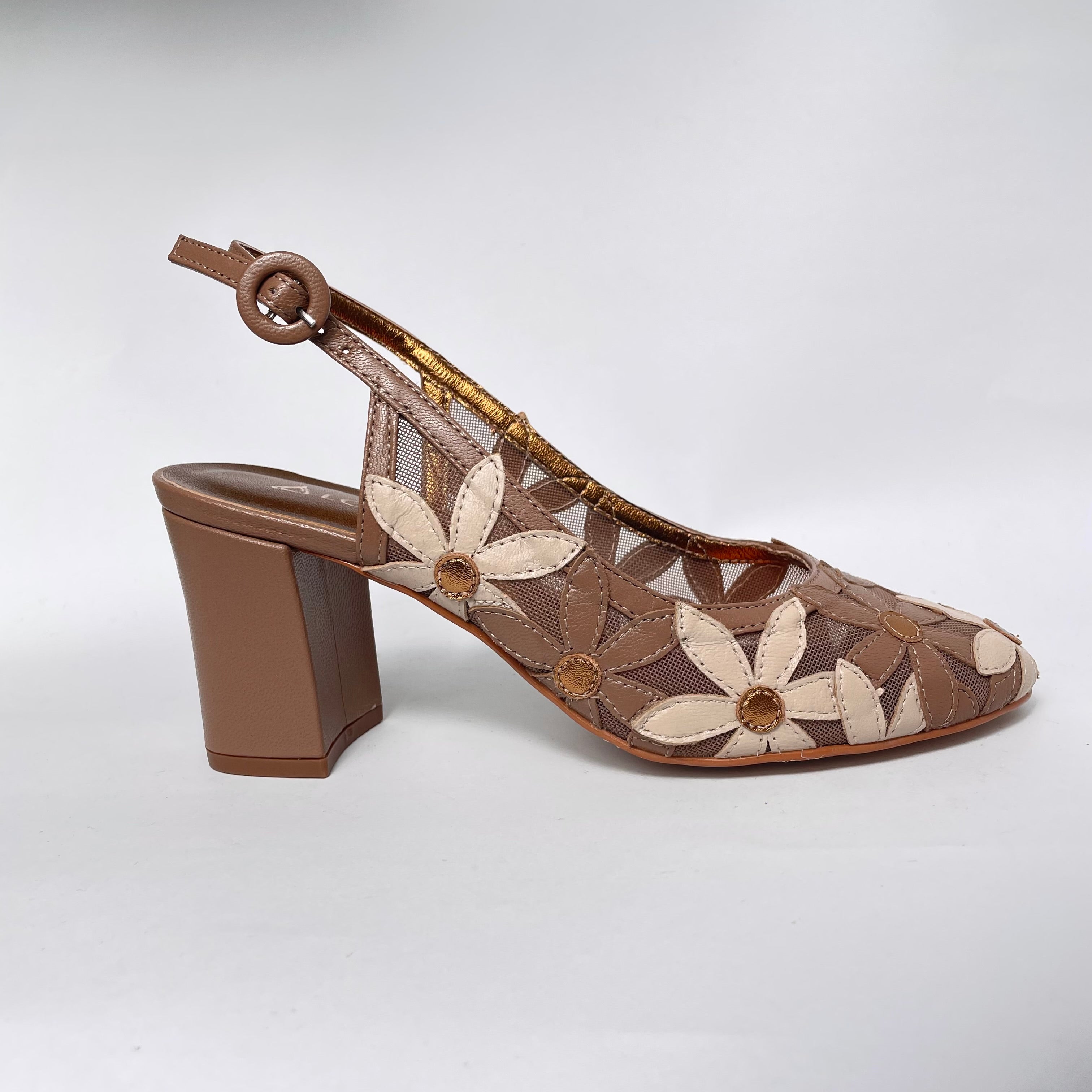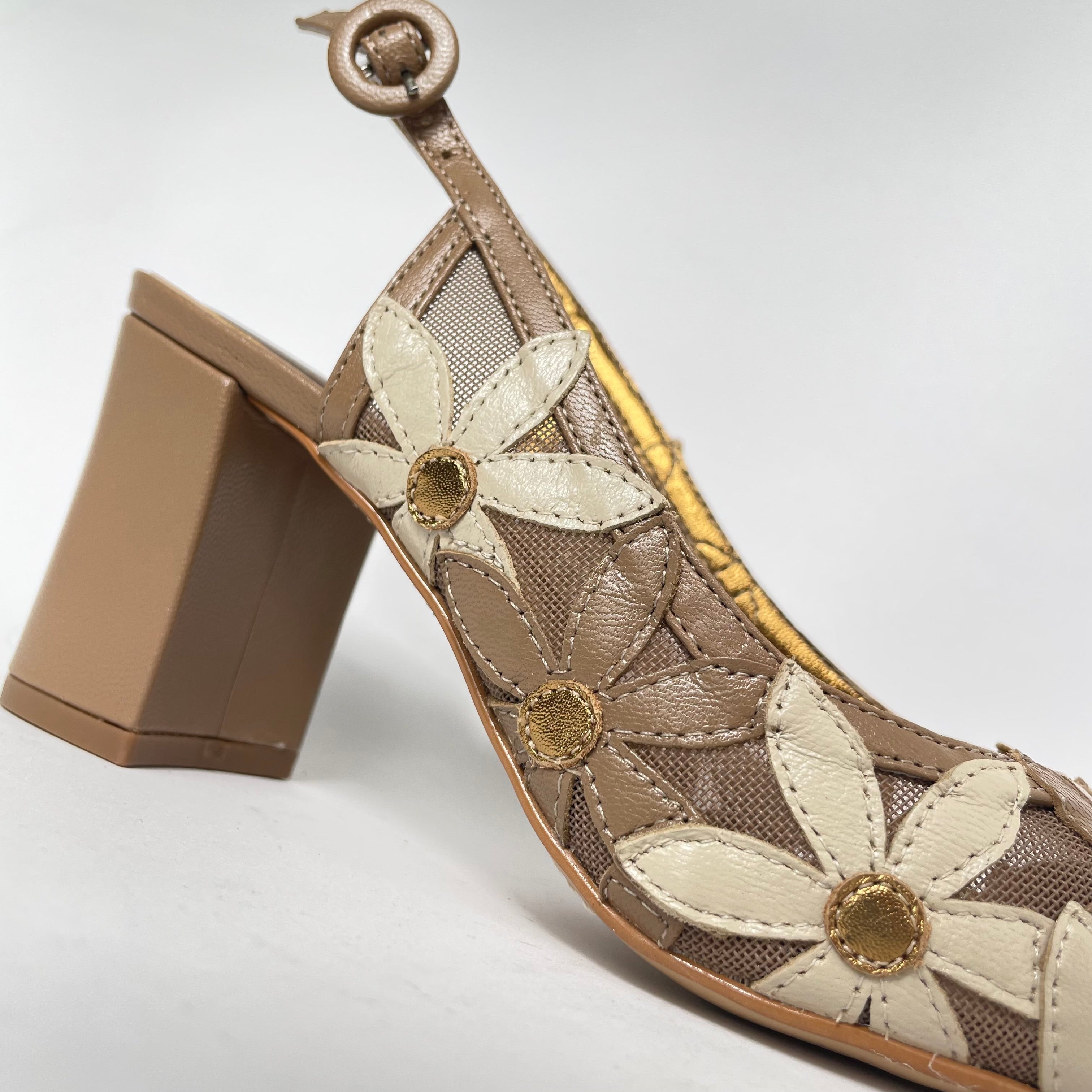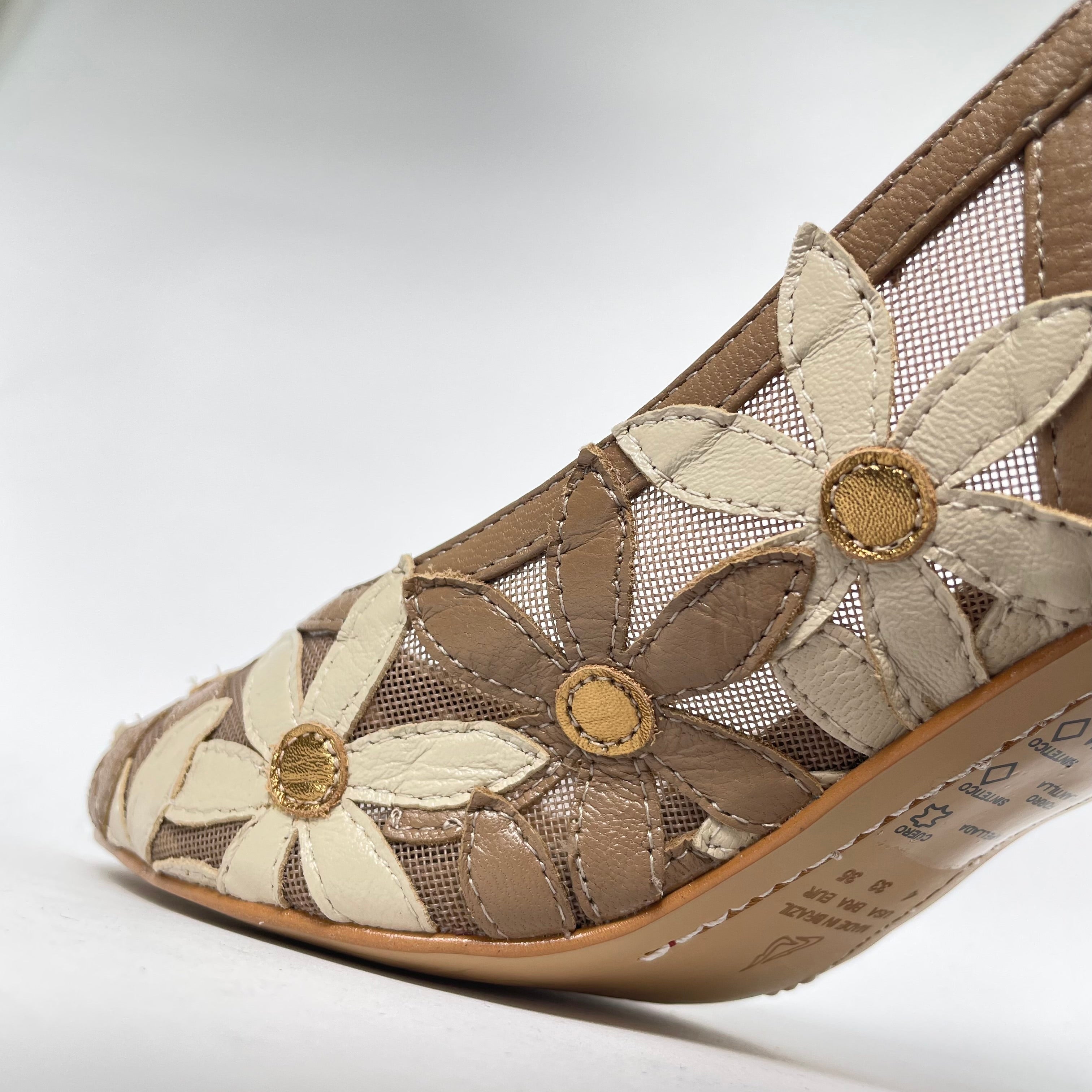 Inspirado en la delicadeza de los jardines mediterráneos, el Sicilia Floral es un zapato lleno de detalles románticos. Bordado con flores en tonos tierra sobre una base de malla translúcida, combina ligereza, feminidad y sofisticación. Su tacón medio y forma estilizada lo convierten en una opción cómoda y elegante para eventos de día o tarde. Un modelo que aporta frescura y distinción con cada paso.