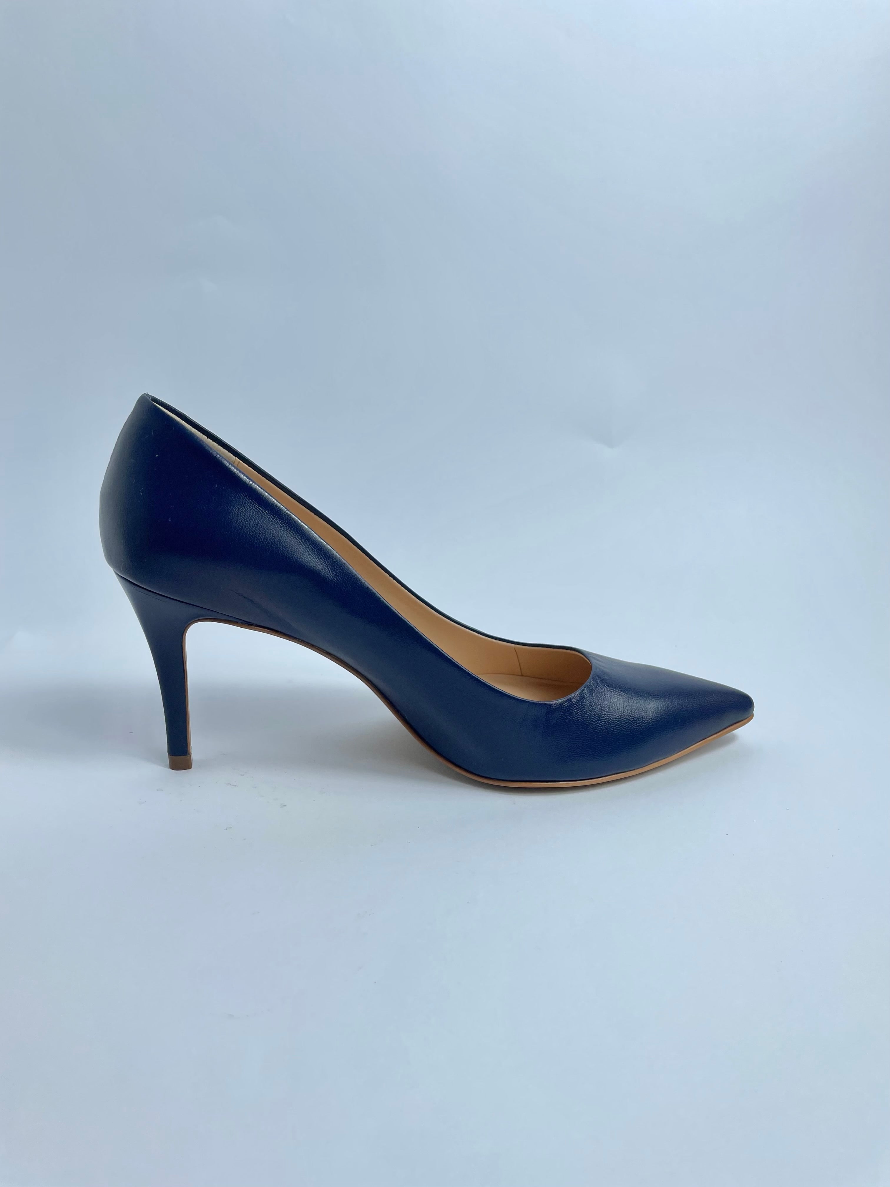 Tacón delgado en tono azul con acabado liso y punta fina. Un básico elegante y atemporal que combina con cualquier look, ideal para llevar del día a la noche con total sofisticación.