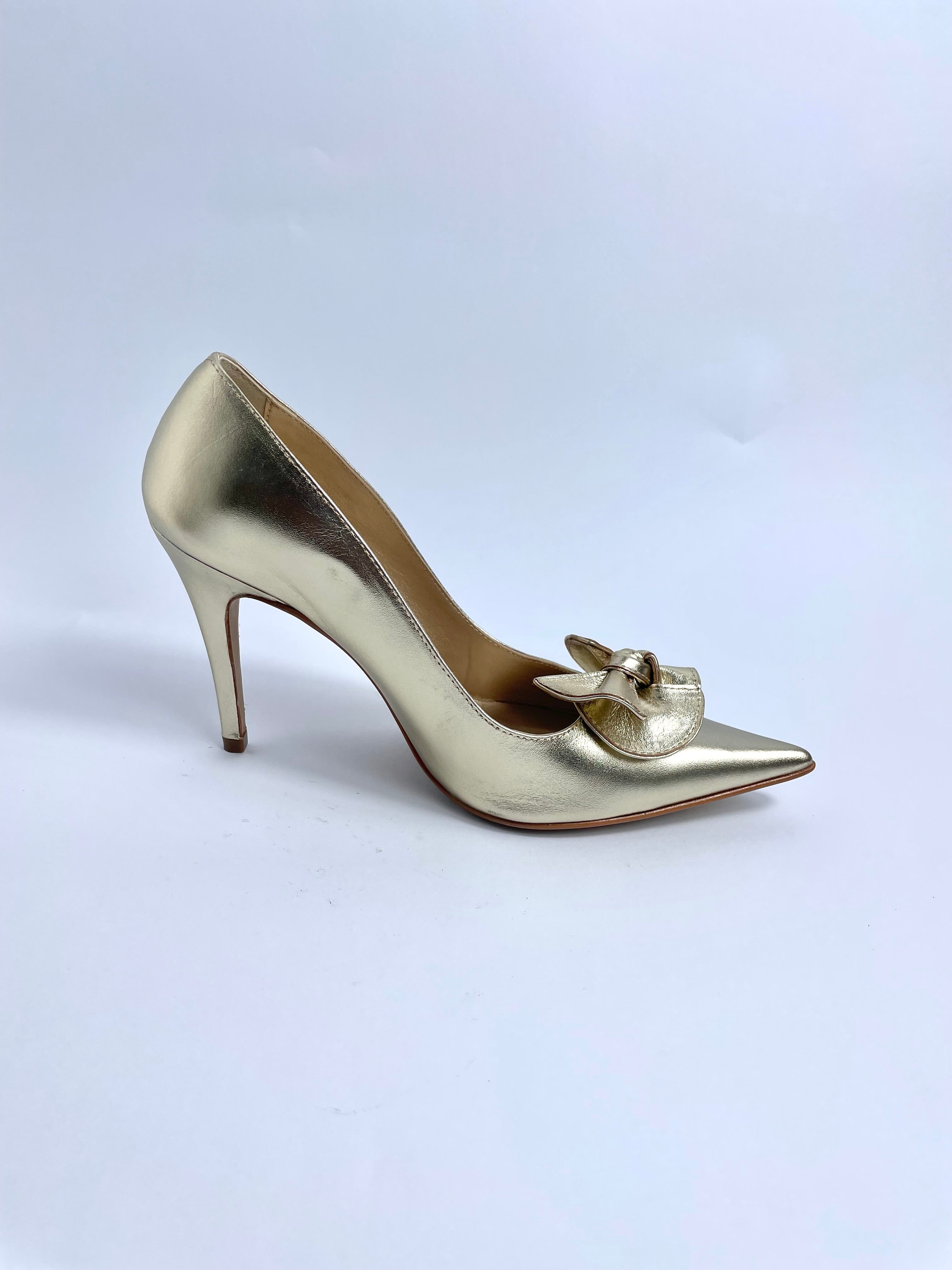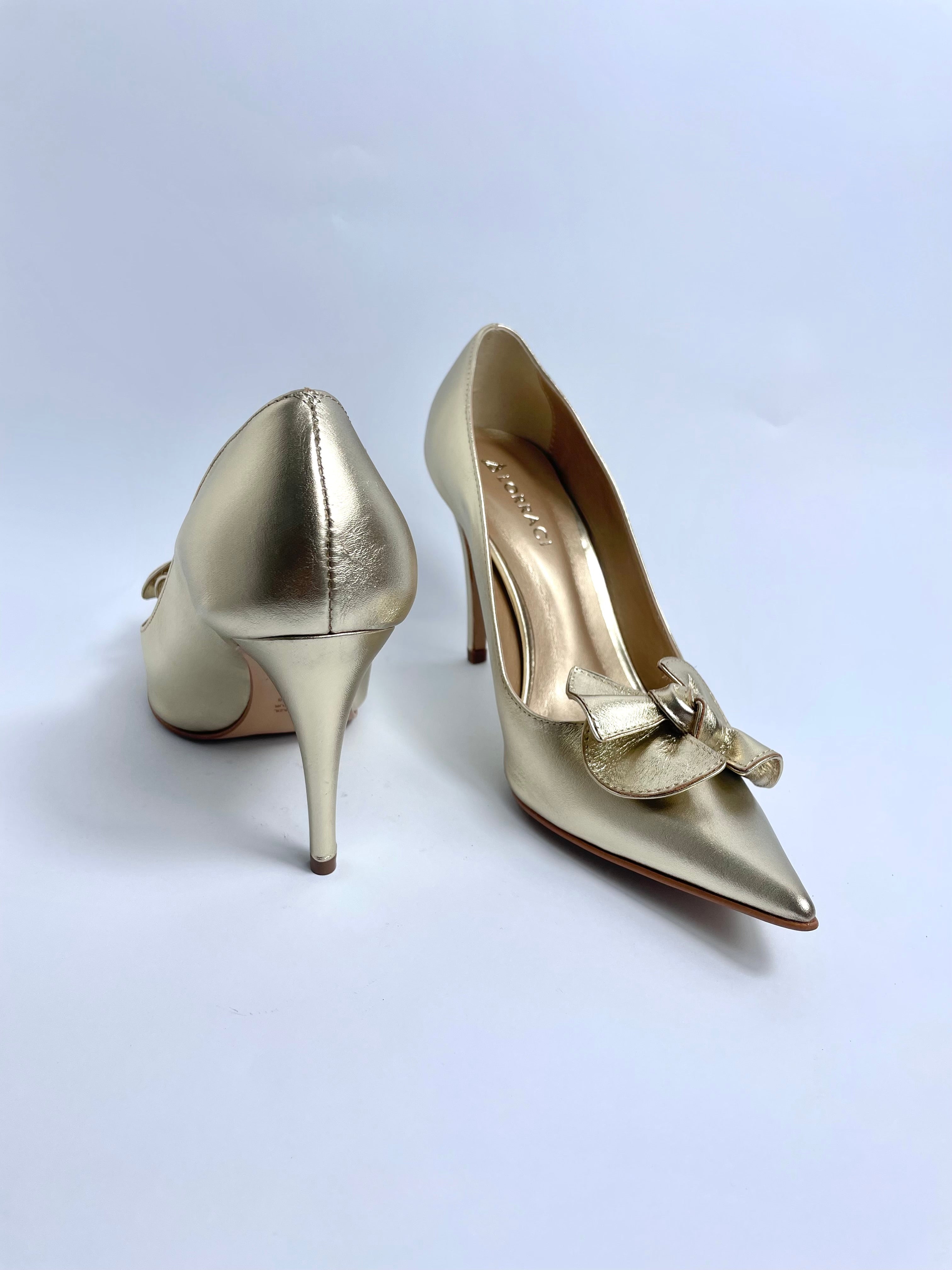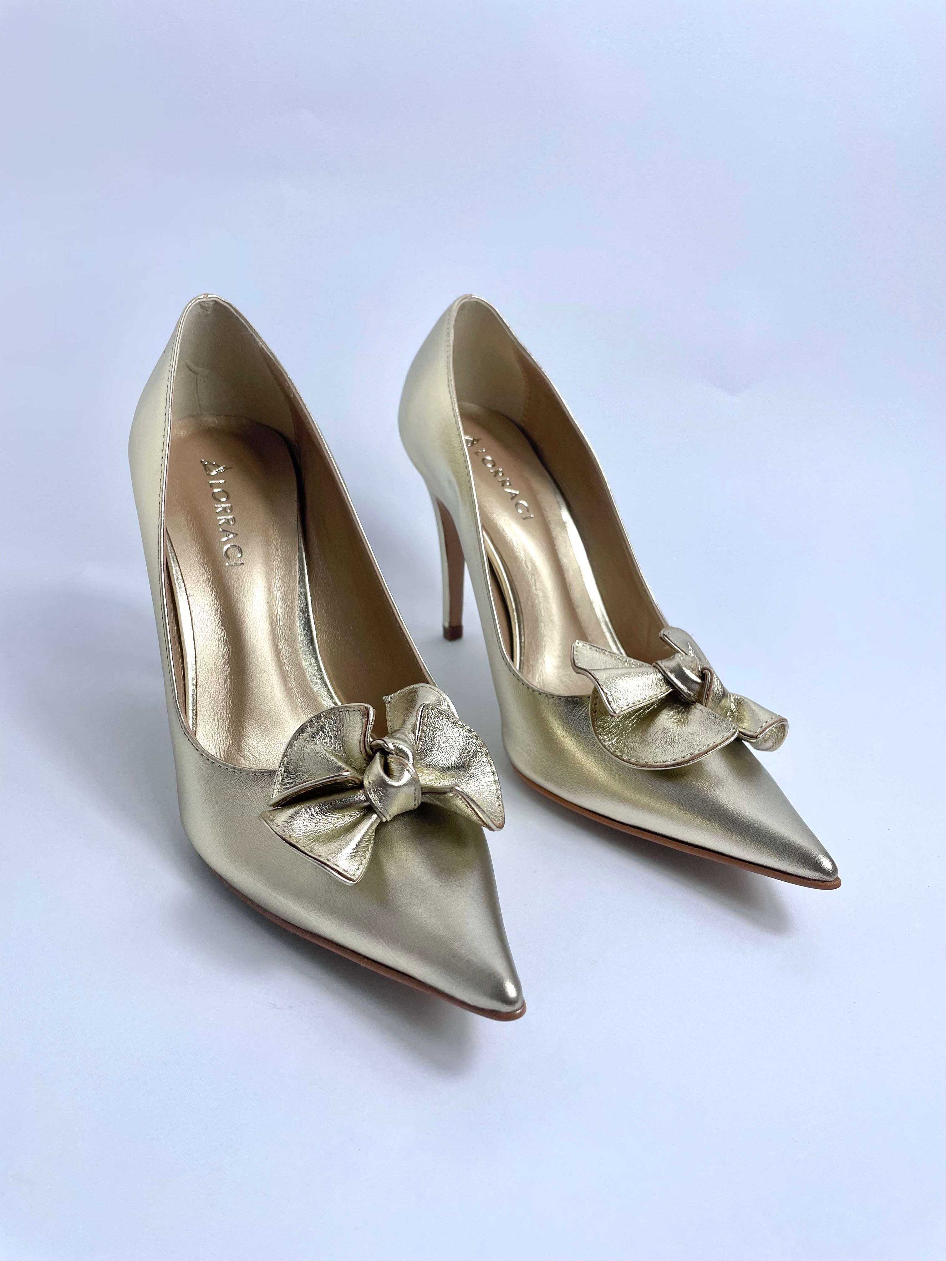 Tacón alto en dorado metalizado con punta fina y lazo decorativo al frente. Un diseño glamuroso y femenino que aporta elegancia y brillo a cualquier ocasión especial.