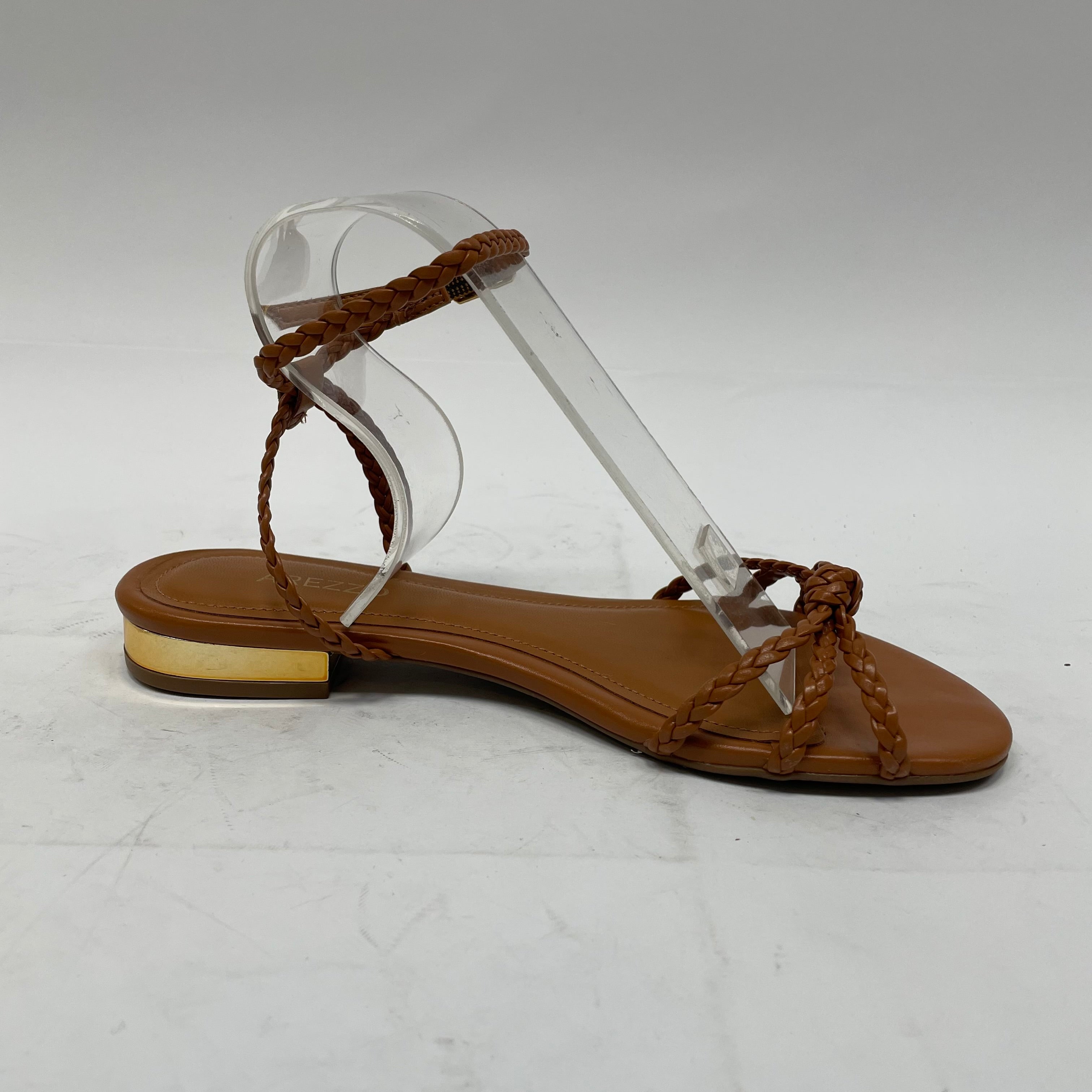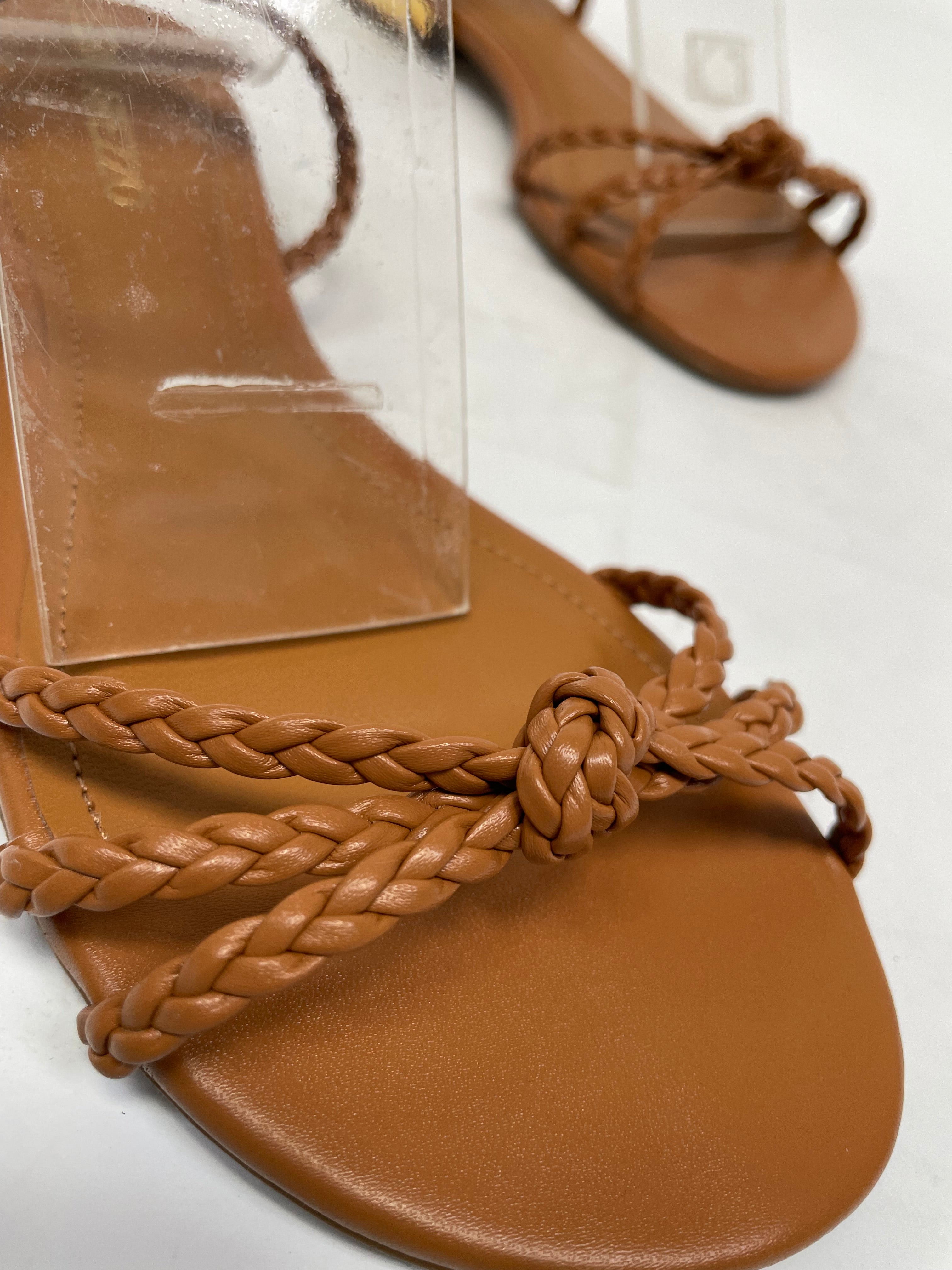 Con tiras finamente trenzadas que envuelven el pie con delicadeza, y un toque dorado en el talón que eleva el diseño sin perder su esencia natural. Su tono cuero es versátil, ideal para combinar con prendas en lino, blanco, beige o estampados tierra. Un modelo ligero, cómodo y chic para recorrer el verano con elegancia.