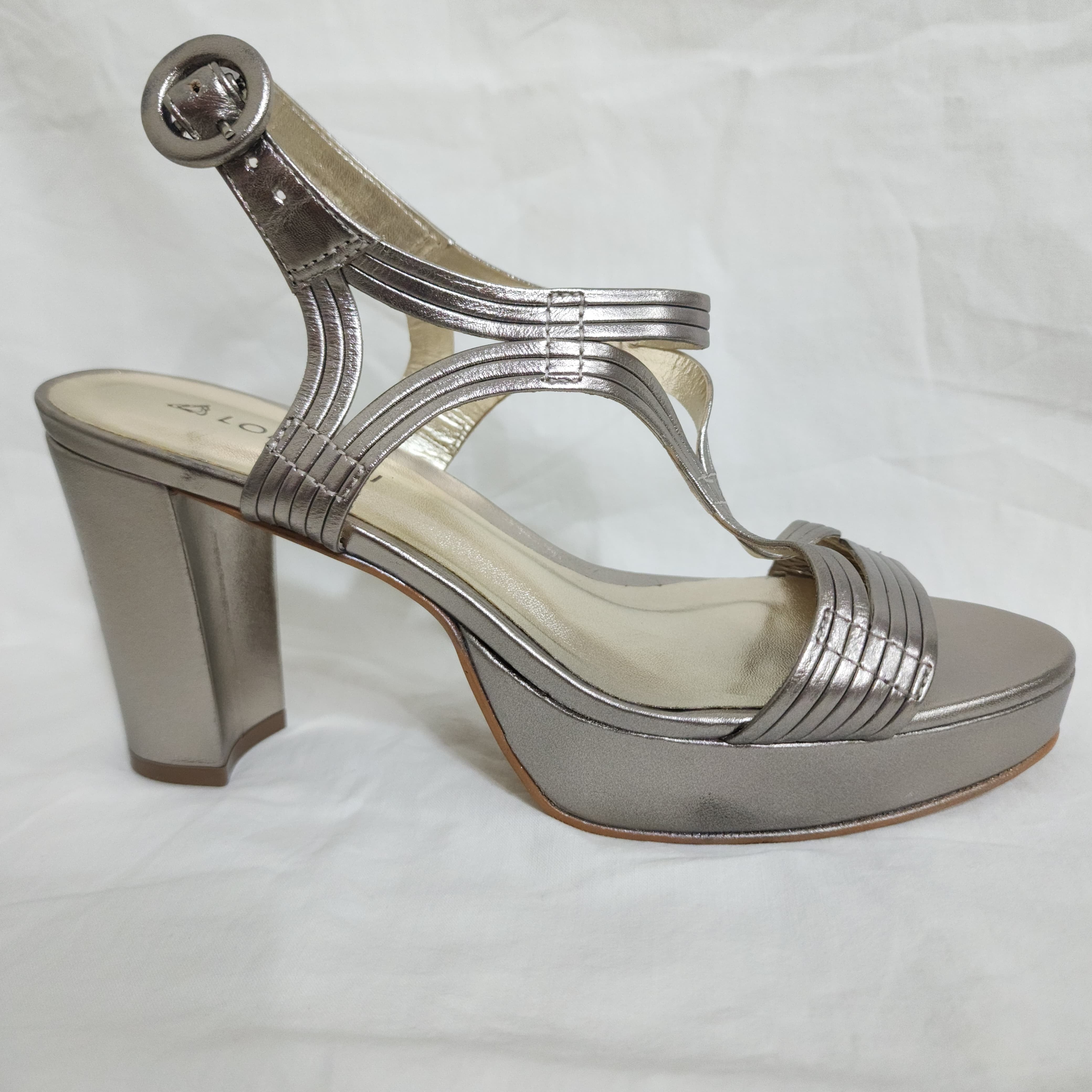 Es la sandalia que ilumina con estilo. Su acabado metalizado en tono plata le da un aire contemporáneo y versátil, ideal para eventos de noche, fiestas o combinaciones modernas en tonos neutros. El tacón grueso y la plataforma brindan seguridad y altura, mientras que las tiras estilizadas aportan sofisticación a cada paso. Un modelo que combina diseño impactante y comodidad en su máxima expresión.