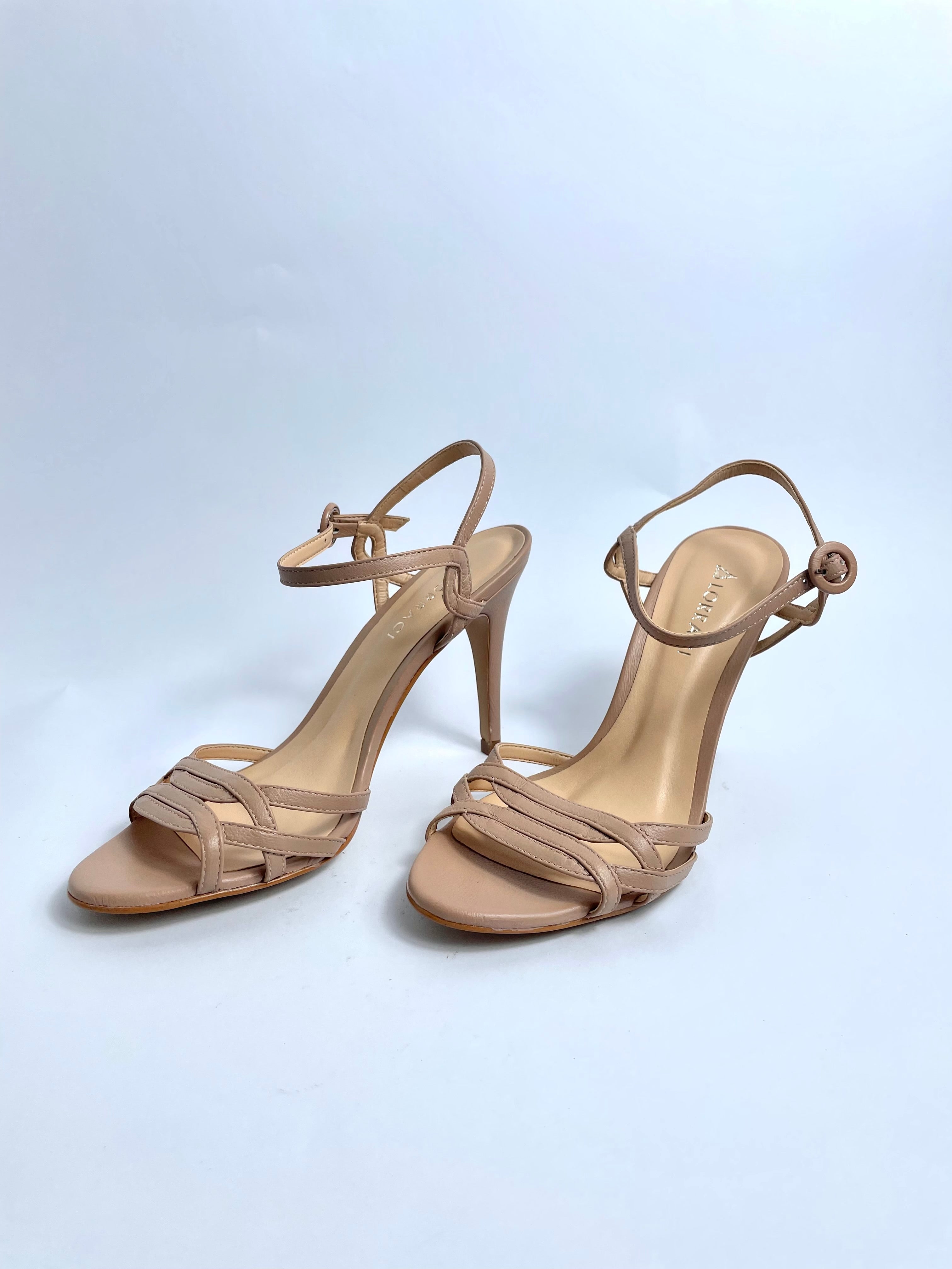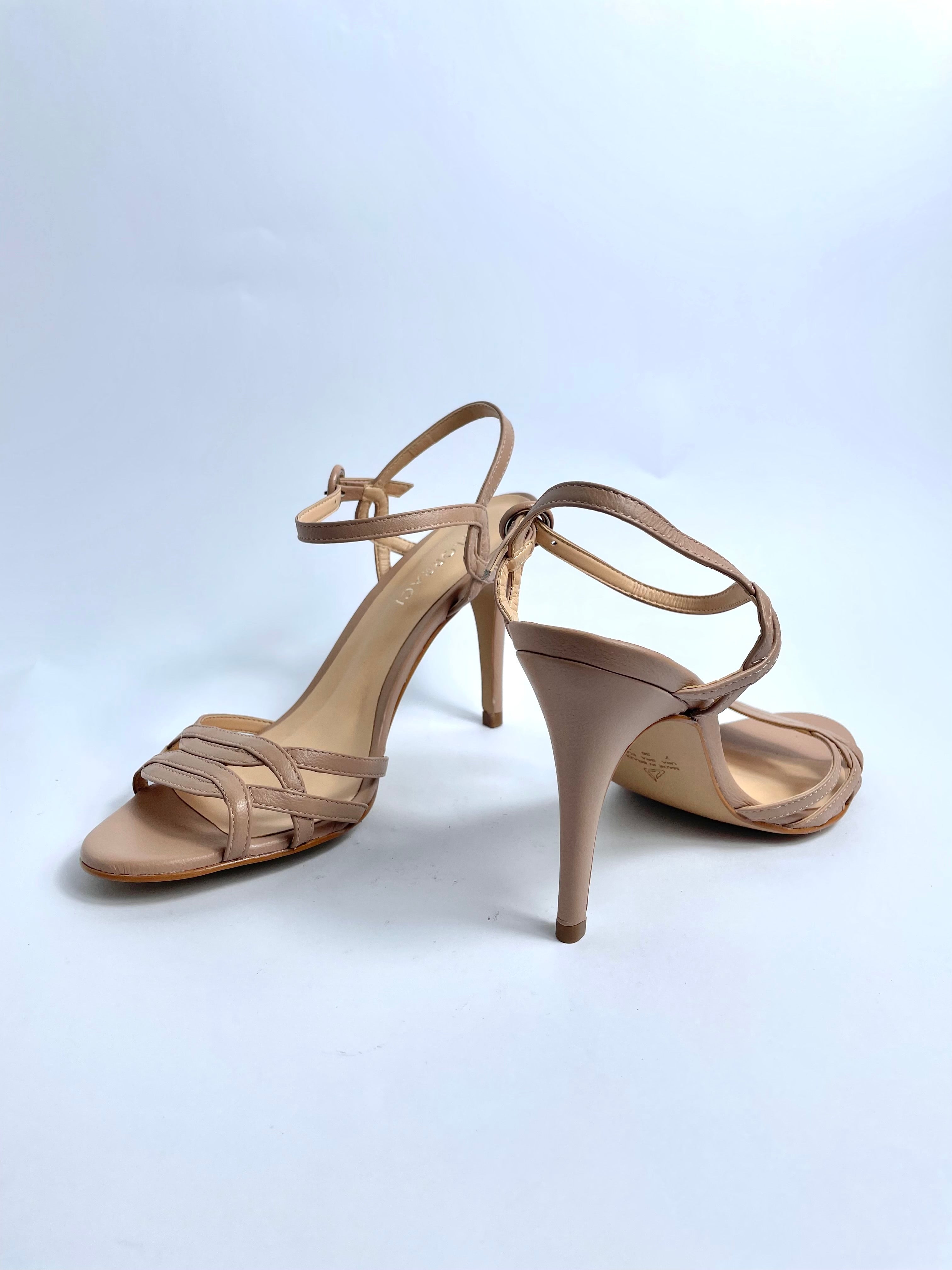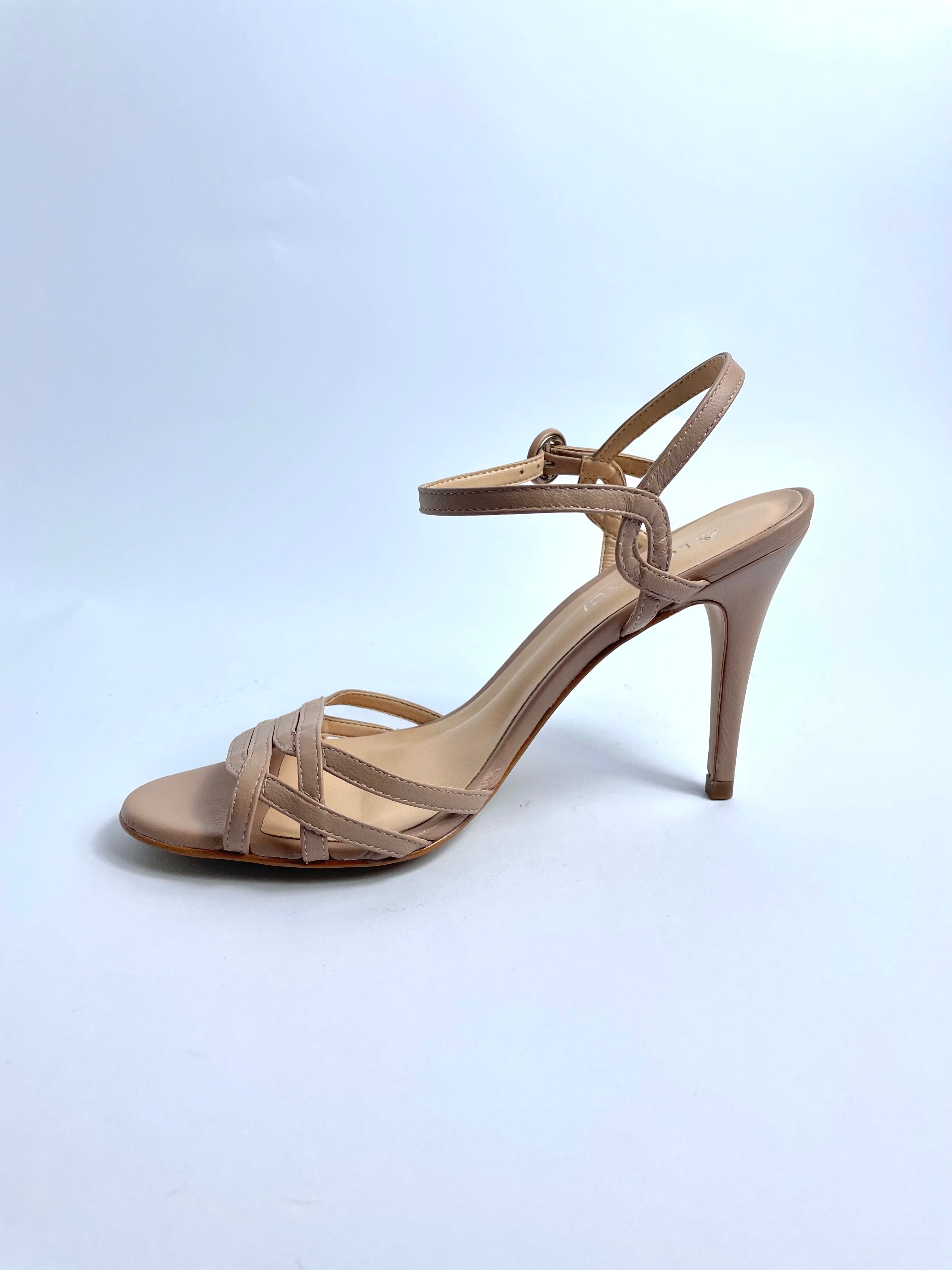 Tacón alto delgado en tono nude con delicadas tiras cruzadas y pulsera al tobillo. Un diseño minimalista y elegante que estiliza la silueta y realza cualquier look con sofisticación.